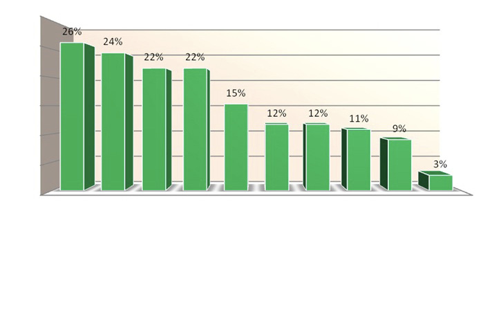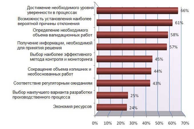 В целом, респонденты положительно оценили влияние системы управления рисками на деятельность предприятия (рис. 10). Более половины респондентов отметили, что управление рисками обеспечивает достижение необходимого уровня уверенности в процессах (66%), возможность установления наиболее вероятной причины отклонения (61%), определение необходимого объема валидационных работ (58%), получение информации, необходимой для принятия решений (57%). Обращает на себя внимание достаточно низкий процент предприятий, проводивших экономическую оценку применения системы управления рисками – 24% и использовавших методологию рисков для фармацевтической разработки – 25% (рис. 4, где 27% ответили о применении этой методологии при фармацевтической разработке). Обращает на себя внимание достаточно большое количество респондентов (57%), которые не считают эти работы обязательными и обеспечивающими соблюдение установленных требований, хотя это требование вступило в действие почти 7 лет назад. Также, на наш взгляд, слишком мало предприятий (57%) используют риск-ориентированный подход для принятия решений.