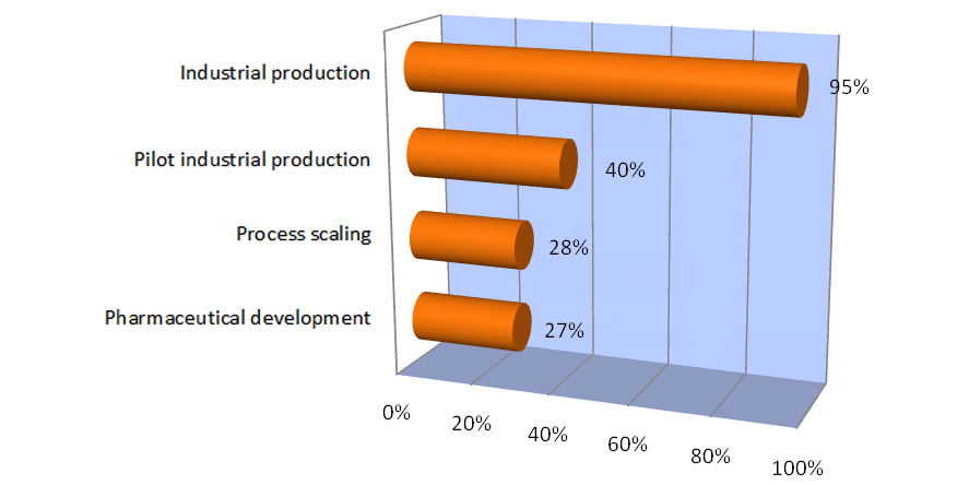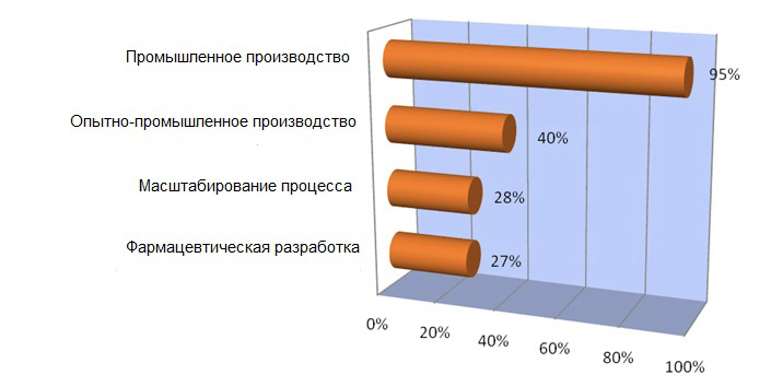 Управление рисками для качества применяется в российской фармацевтической отрасли на различных этапах жизненного цикла продукта: большинство предприятий применяют управление рисками на этапе промышленного производства (95%), и только 28% предприятий применяют риск-ориентированный подход при масштабировании процесса (рис. 4).