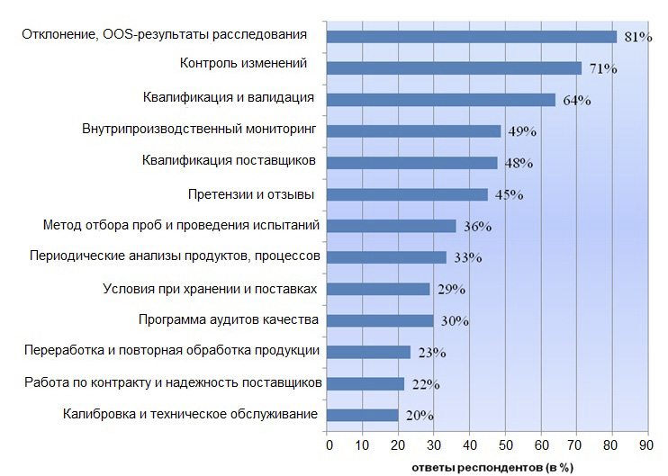 Области работ, в которых предприятия используют управление рисками для качества, приведены на рисунке 5. Как видно, в целом, они совпадают с предлагаемыми в Приказе Министерства промышленности и торговли Российской Федерации № 1997 «Об утверждении Рекомендаций по организации производства и контроля качества лекарственных средств» областями деятельности на фармацевтическом предприятии, где применимо управление рисками для качества. Следует обратить внимание на незначительный процент предприятий, использующих эту методологию для организации работ по калибровке и техническому обслуживанию (20%), при переработке и повторной обработке продукции (23%), при хранении и поставках (29%).