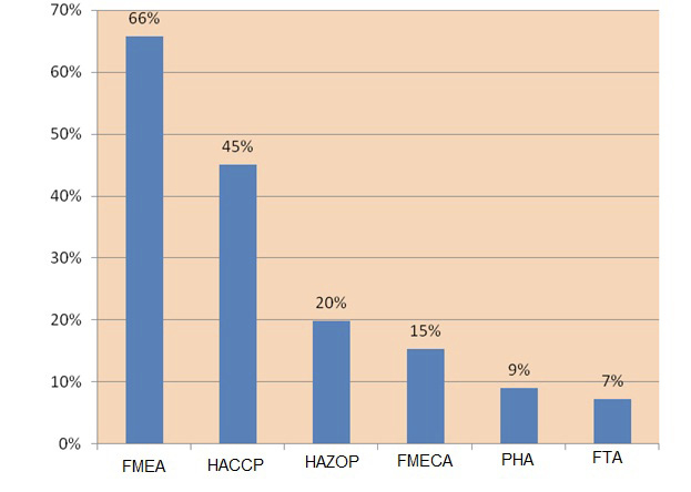 В большинстве случаев для оценки и анализа рисков отечественные предприятия применяют количественные методы (FMEA, HACCP, FMECA, PHA, FTA и др.). Из 7 методов, указанных в руководстве ICH Q9 и в Приказе Министерства промышленности и торговли Российской Федерации № 1997 «Об утверждении Рекомендаций по организации производства и контроля качества лекарственных средств», наиболее часто используемые методы – FMEA (66%), HACCP (45%), HAZOP (20%), FMECA (15%) (рис. 6).