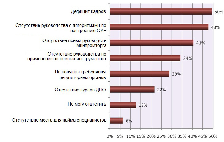 Основными причинами, по мнению респондентов, являются: дефицит кадров (50%), отсутствие руководства, пособий с алгоритмами по выработке решений и построению системы управления рисками (48%), отсутствие ясных руководств Минпромторга (41%), отсутствие руководств по применению основных инструментов анализа рисков (34%). Если суммировать все причины, связанные с отсутствием дополнительных руководств Минпромторга России, то это будет превалирующая причина сложности внедрения рассматриваемой методологии. Расширенный анализ ответов в отношении дефицита кадров выявил приблизительно одинаковый процент ответов у сотрудников малых и микропредприятий: проблему дефицита кадров отметили 59% респондентов, работающих предприятиях численностью от 20 до 50 работающих; 53% – от 50 до 100 работающих; 50% – от 100 до 500; 43% – от 500.