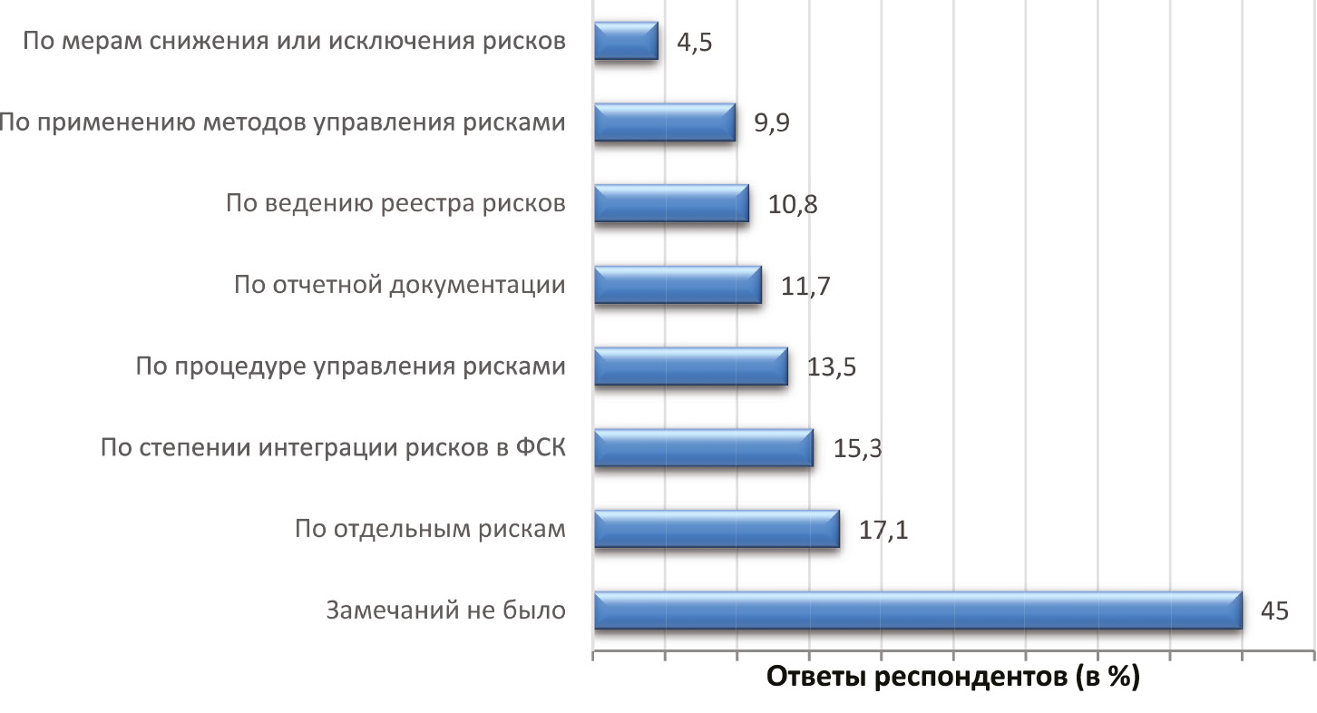 Интересные данные были получены при анализе ответов в отношении замечаний внешних аудиторов в отношении имеющейся на предприятии системе управления рисками для качества лекарственных средств (рис. 9). Чуть больше половины предприятий получали замечания по своей системе управления рисками. При этом количество замечаний по различным аспектам этих работ приблизительно одинаково, кроме мероприятий по снижению или исключению выявленных рисков для качества.
