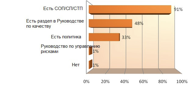 В отношении документа, регламентирующего систему управления рисками для качества на предприятии и используемые подходы к управлению рисками, 91% респондентов подтвердили наличие на предприятии такого документа, и еще 33% отметили наличие политики в области системы управления рисками (рис. 11). Почти половина респондентов (48%) указали, что система управления рисками включена в руководство по качеству.