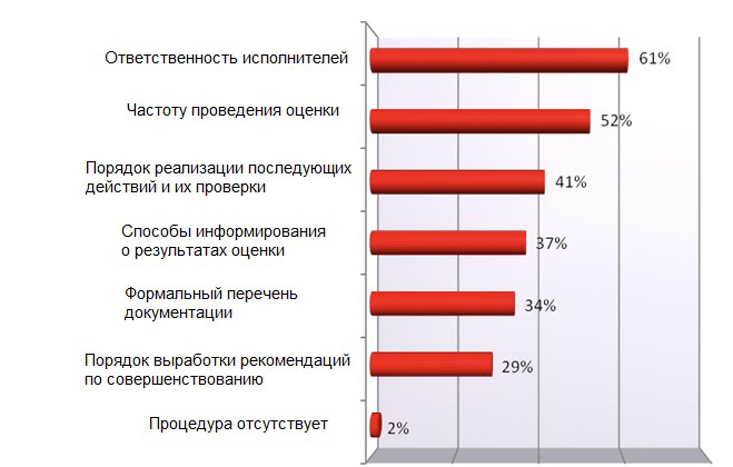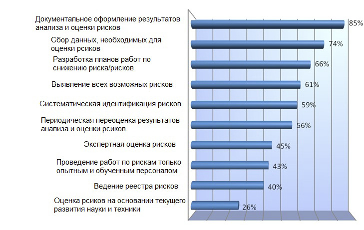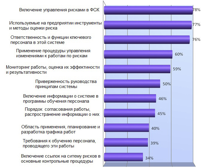 Используемые в российской фармацевтической отрасли подходы к формализации системы управления рисками приведены на рисунке 12. Как видно из приведенных данных, все международные критерии выполняются, но степень их выполнения варьирует от 78% случаев до 34%. Следует отметить, что и внешние аудиторы не обращают внимание производителей на отсутствие в описании системы управления рисками таких важных аспектов, как приверженность руководства принципам системы, ответственность и функции ключевого персонала в этой системе, порядок согласования работ и распространение информации о них, применение процедуры управления изменениями к работам по рискам, включение ссылок на систему рисков в основные контрольные процедуры предприятия (рис. 9). Значительное количество предприятий не обращает должного внимания на обучение персонала системе управления рисками (54%) и установление требований к обучению персонала (61%), на важность обеспечения информационных потоков в системе управления рисками (55%). В совокупности с данными, приведенными на рисунке 10, отсутствие формализованного подтверждения, другими словами – обязательств, приверженности принципам системы управления рисками свидетельствует о низкой информированности и заинтересованности высшего руководства половины или более фармацевтических предприятий в России в системе управления рисками и ее возможностях для бизнеса.