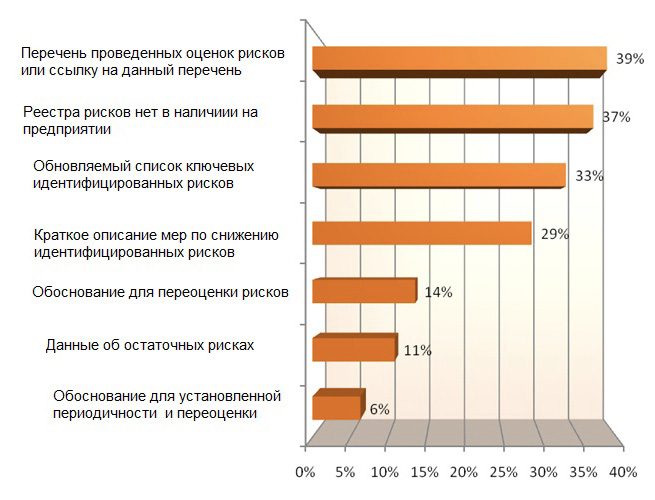Очень большой пробел был выявлен в отношении ведения реестра рисков для качества (рис. 14). Во-первых, только около 40% респондентов ответили, что на предприятии есть в наличии реестр рисков для качества (рис. 13 и 14). Во-вторых, содержание реестра рисков российского производителя также отличается от международной практики. Так, только 39% предприятий включают в реестр перечня проведенных оценок рисков или ссылки на данный перечень; наличие обновляемого списка ключевых идентифицированных рисков имеется только на 33% предприятий. Следует отметить очень низкий процент предприятий, включающих в реестр обоснований для переоценки рисков и для установления периодичности переоценки (14% и 6% соответственно), а также данные об остаточных рисках (11%).