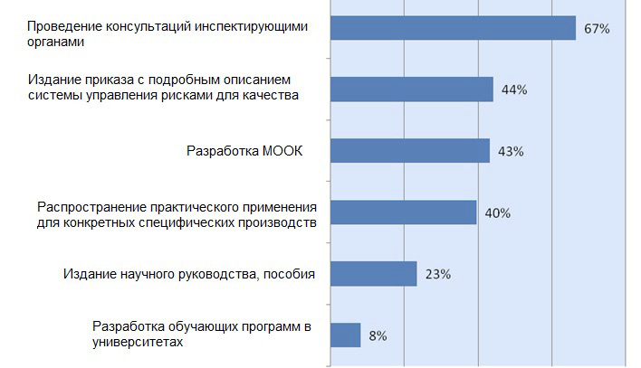 На основании всех вышеприведенных данных мы сделали вывод о превалировании в российской фармацевтической отрасли поверхностного подхода к управлению рисками для качества, что обусловлено рядом объективных и субъективных причин. Из наиболее значимых следует выделить отсутствие рекомендаций Минпромторга России по созданию эффективной системы управления рисками для качества и дефицит в отрасли специалистов, готовых к проведению работ в этой области.