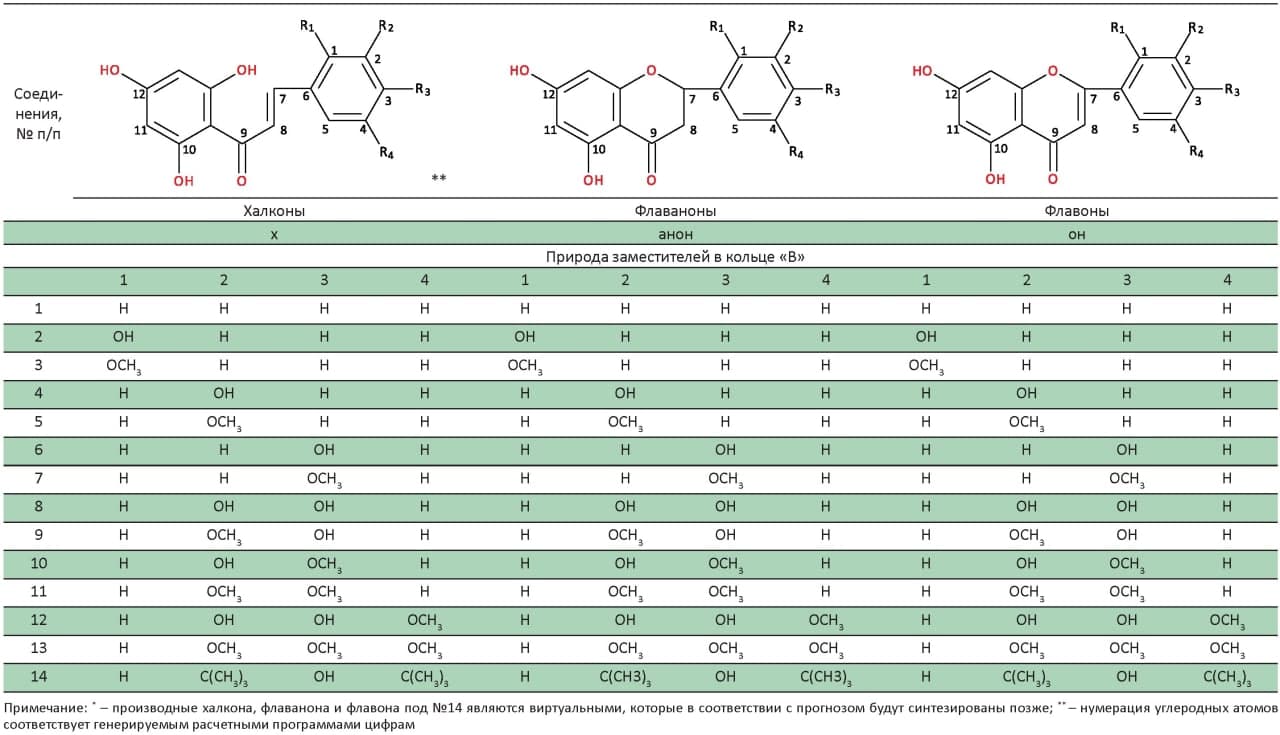 Таблица 1 – Производные халкона, флаванона и флавона с флороглюциновым кольцом «А»*