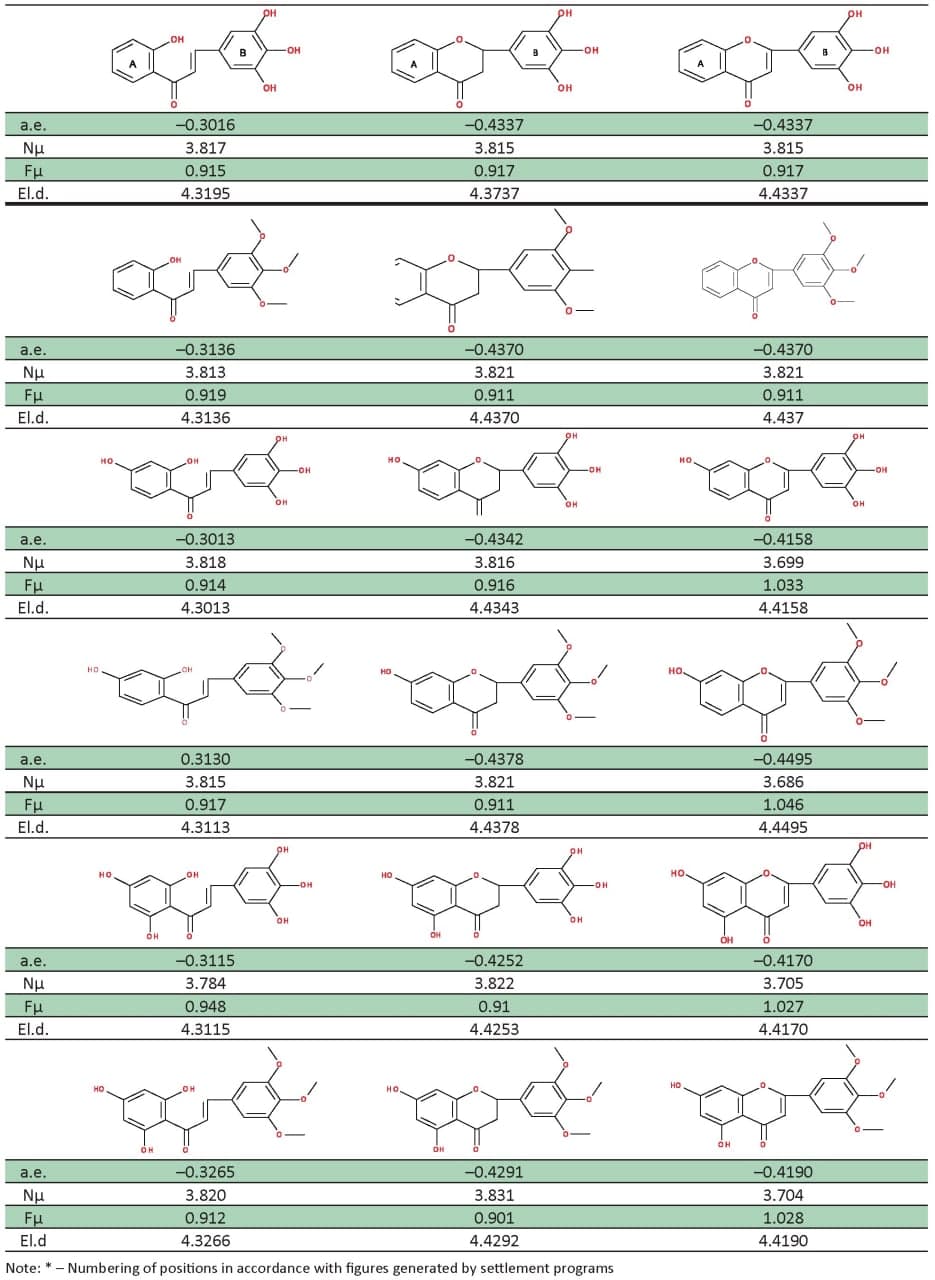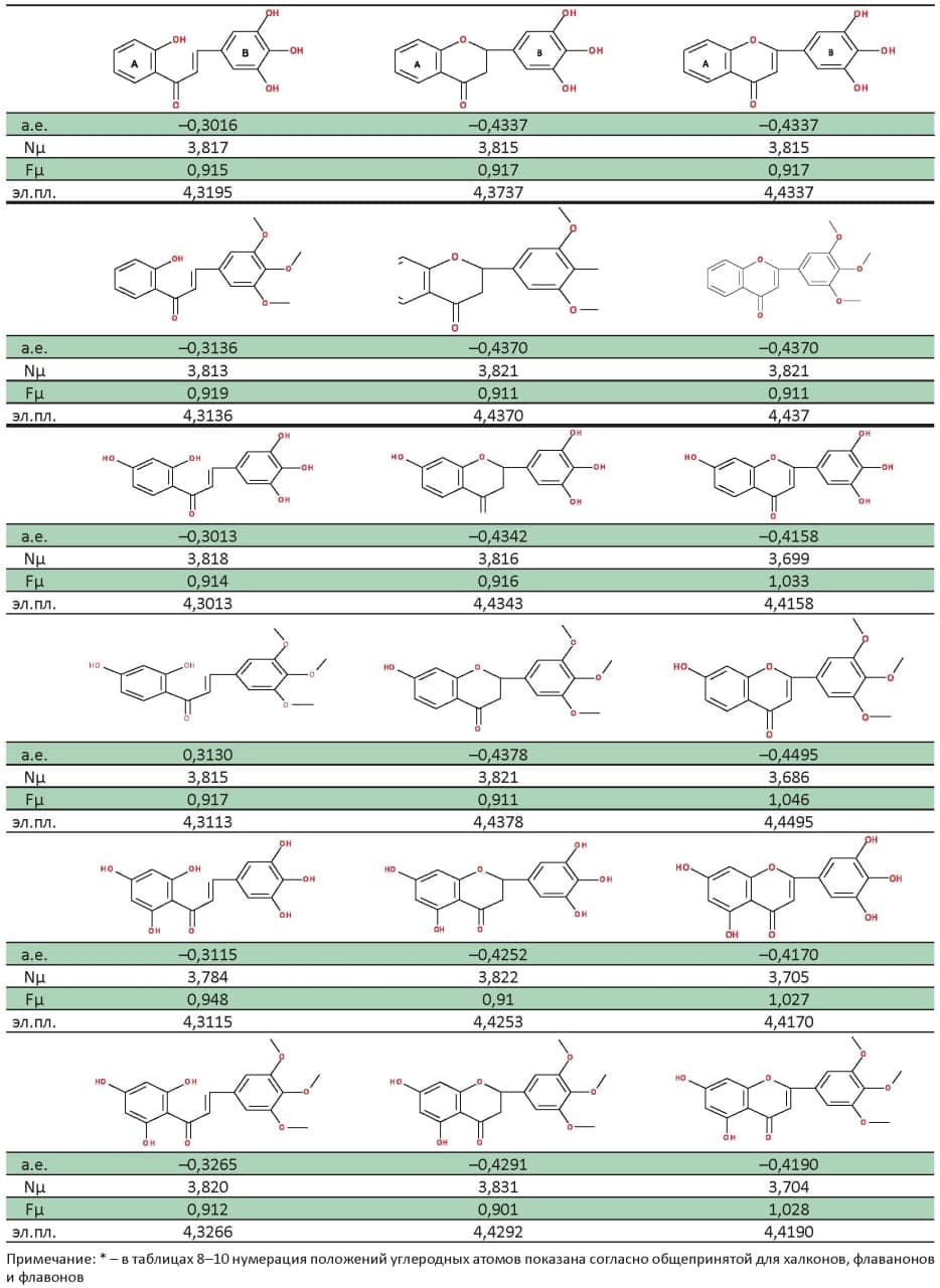 В таблице 3 приведены значения Nµ и Fµ для анализируемых флаванонов. Сравнивая их с аналогичными характеристиками для халконов (табл. 2), можно заметить, что у флаванонов связевые числа и, соответственно, индексы свободной валентности принципиально не отличаются от таковых халконов.
