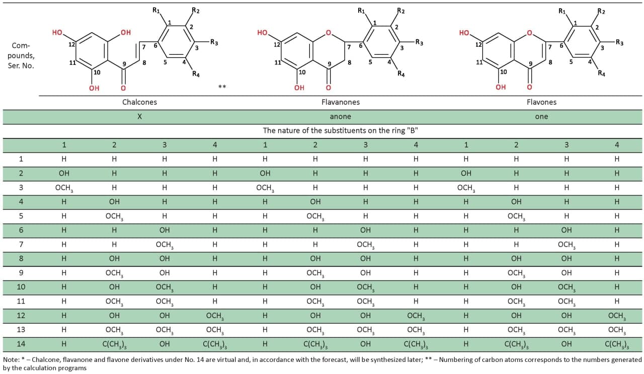 42 derivatives of chalcone, flavanone and flavone having a phloroglucinic type of ring “A” and containing the same electron-donating substituents on ring “B”, have been studied. Flavonoids with the phloroglucinic type of ring “A” are the most common in nature, which is due to the peculiarities of biogenetic formation with the participation of malonyl and acetyl fragments.