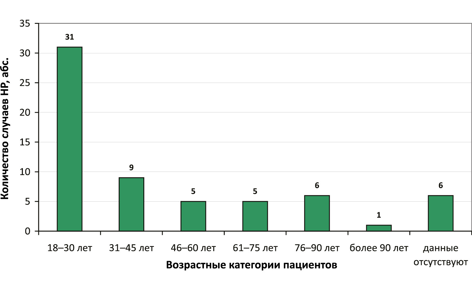 Научный интерес представлял также анализ возрастных категорий пациентов, у которых были зарегистрированы случаи развития НР на антианемические препараты. В 4 случаях (4,5% от общего количества случаев) НР наблюдались у пациентов детского возраста (от 0 до 18 лет). В остальных 62 картах –извещениях НР наблюдались у пациентов старше 18 лет. Распределение частоты случаев НР на антианемические препараты в этой возрастной группе представлено на рисунке 1.
