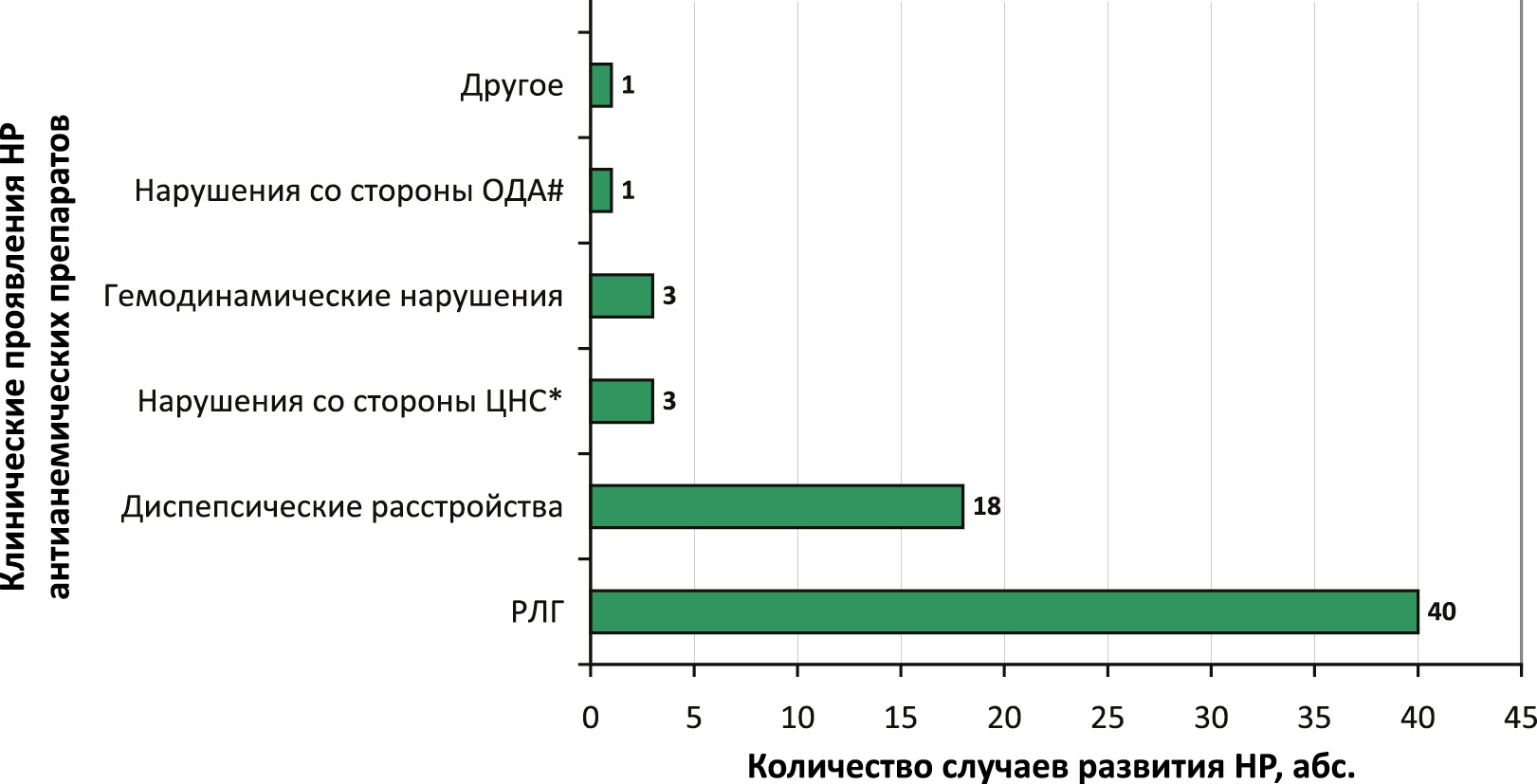 Анализ карт-извещений о НР, зарегистрированных в Республике Крым, позволили выявить, что препаратами-«лидерами» по частоте развития НР при применении антианемических препаратов являются комбинированные препараты железа. Наиболее частыми клиническими проявлениями НР были реакции лекарственной гиперчувствительности (40 случаев) и диспепсические расстройства (18 случаев). Частота серьезных нежелательных реакций составила 8 случаев (12,1% от общего количества НР), что свидетельствует о достаточно высоком профиле безопасности антианемических препаратов.