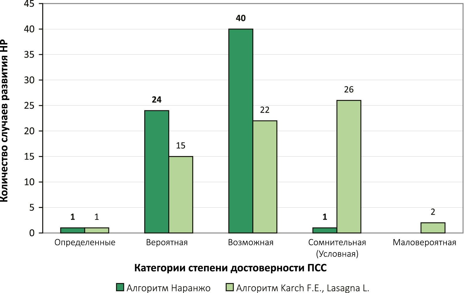 Изучение степени достоверности причинно-следственной связи (ПСС) проводилось в соответствии с алгоритмами Наранжо и Karch F.E., Lasagna L.3 [8]. В соответствии с алгоритмом Наранжо, степень ПСС оценивается определенным количеством баллов, полученных при ответе на вопросы опросника. Категории степени достоверности, выраженные в баллах, классифицируются следующим образом: определенная (9 и более баллов), вероятная (5–8 баллов), возможная (1–4 балла), сомнительная (0 и менее баллов). Оценка ПСС с помощью алгоритма Karch-Lasagna предполагает ответ на 5 вопросов с их балльной оценкой и выделением 5 основных категорий ПСС: определенной (8 и более баллов), вероятной (6–7 баллов), возможной (4–5 баллов), условной (1–3 балла), маловероятной (0 и менее баллов).