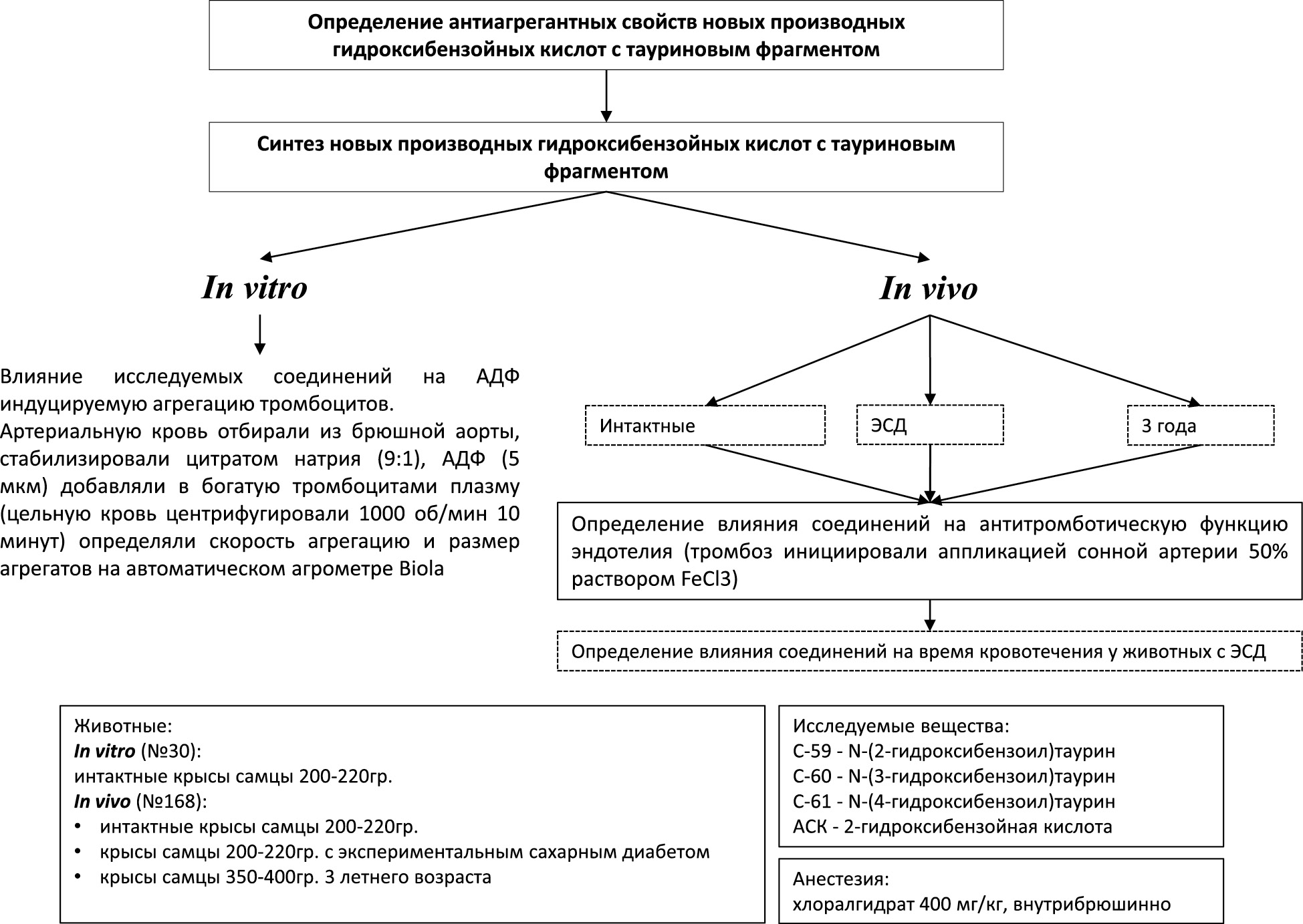 Материалы и методы. Для подтверждения структуры, синтезированных новых производных гидроксибензойных кислот с тауриновым фрагментом методом ацелирования, использовали тонкослойню хроматографию, ЯМР спектры. Исследования in vitro проводили на модели АДФ-индуцированной агрегации тромбоцитов по методике Born G. в модификации Габбасова В.А. Исследования in vivo проводили на модели артериального тромбоза, индуцированного аппликацией хлоридом железа на следующих группах животных: интактные, с экспериментальным сахарным диабетом и трех годовалые, так же была проведена оценена скорость кровотечения из хвостовой вены.
