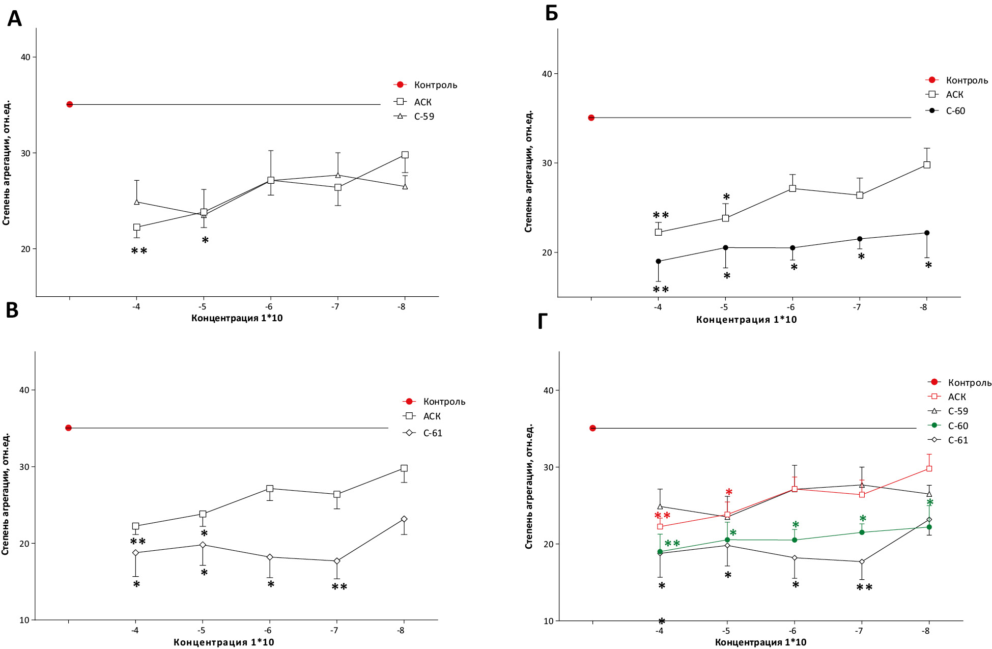 Примечание: А – антиагрегантная активность соединения С-59; Б – антиагрегантная активность соединения С-60; В – антиагрегантная активность соединения С-61; Г – объединенная схема исследуемых соединений, референтного препарата и контроля; * – р < 0,05; ** – р < 0,01 изменения статистически значимы по отношению к контролю критерий Стьюдента с поправкой Бонферрони