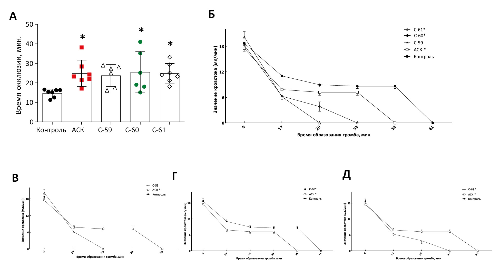 Примечание: А – объединенная схема динамики тромбообразования исследуемых соединений, референтного препарата и контроля; Б –время полной окклюзии сосудов исследуемых соединений, препарата сравнения и контроля; В – динамика тромбообразования соединения С-59; Г – динамика тромбообразования соединения С-60; Д – динамика тромбообразования соединения С-61; * – р<0,05 изменения статистически значимы по отношению к контролю критерий Стьюдента с поправкой Бонферрони