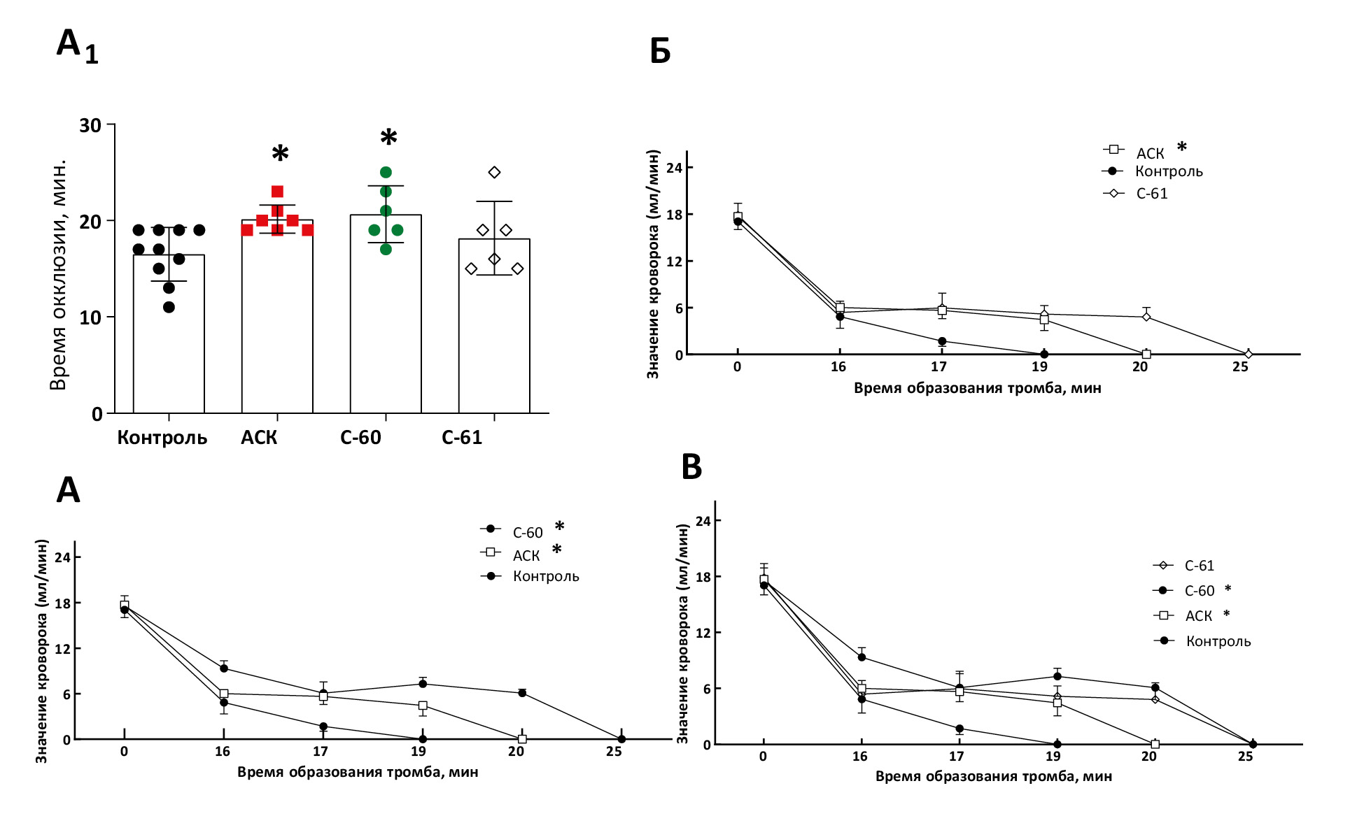 Примечание: А – динамика тромбообразования соединения С-60; А1 – время полной окклюзии сосудов исследуемых соединений, препарата сравнения и контроля; Б – динамика тромбообразования соединения С-61; В – объединенная схема динамики тромбообразования исследуемых соединений, референтного препарата и контроля; * – р<0,05 изменения статистически значимы по отношению к контролю критерий Стьюдента с поправкой Бонферрони