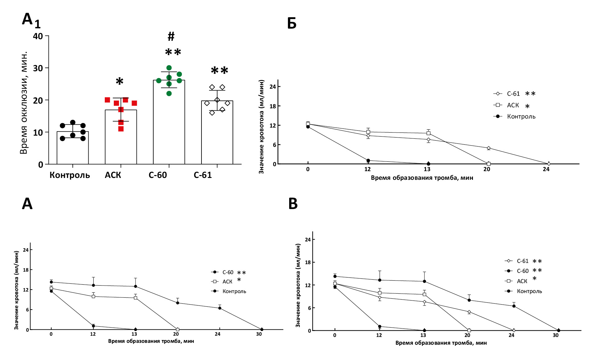 Примечание: А – динамика тромбообразования соединения С-60; А1 – время полной окклюзии сосудов исследуемых соединений, препарата сравнения и контроля; Б – динамика тромбообразования соединения С-61; В – объединенная схема динамики тромбообразования исследуемых соединений, референтного препарата и контроля; * – р < 0,05, ** – р < 0,01 изменения статистически значимы по отношению к контролю критерий Стьюдента с поправкой Бонферрони, #– р < 0,05 изменения статистически значимы по отношению к эффекту референтного препарата критерий Стьюдента с поправкой Бонферрони
