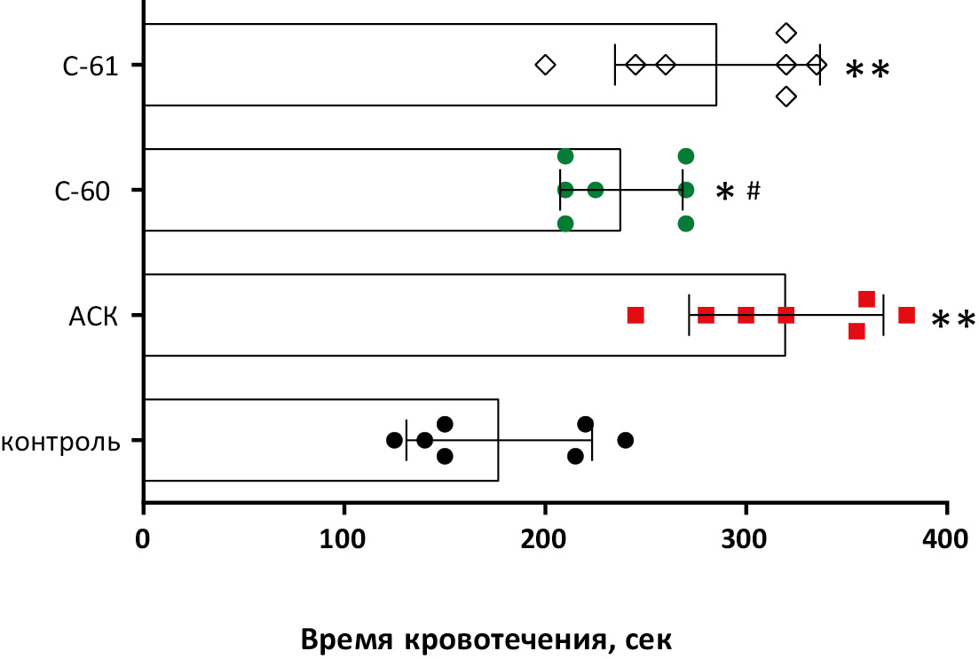 В группе животных, получавших соединение под лабораторным шифром С-60, время кровотечения пролонгировалось до 237,9±11,54 секунд, что на 34% медленнее относительно показателей группы контроля и на 26% быстрее, чем у группы животных, получавших препарат сравнения.