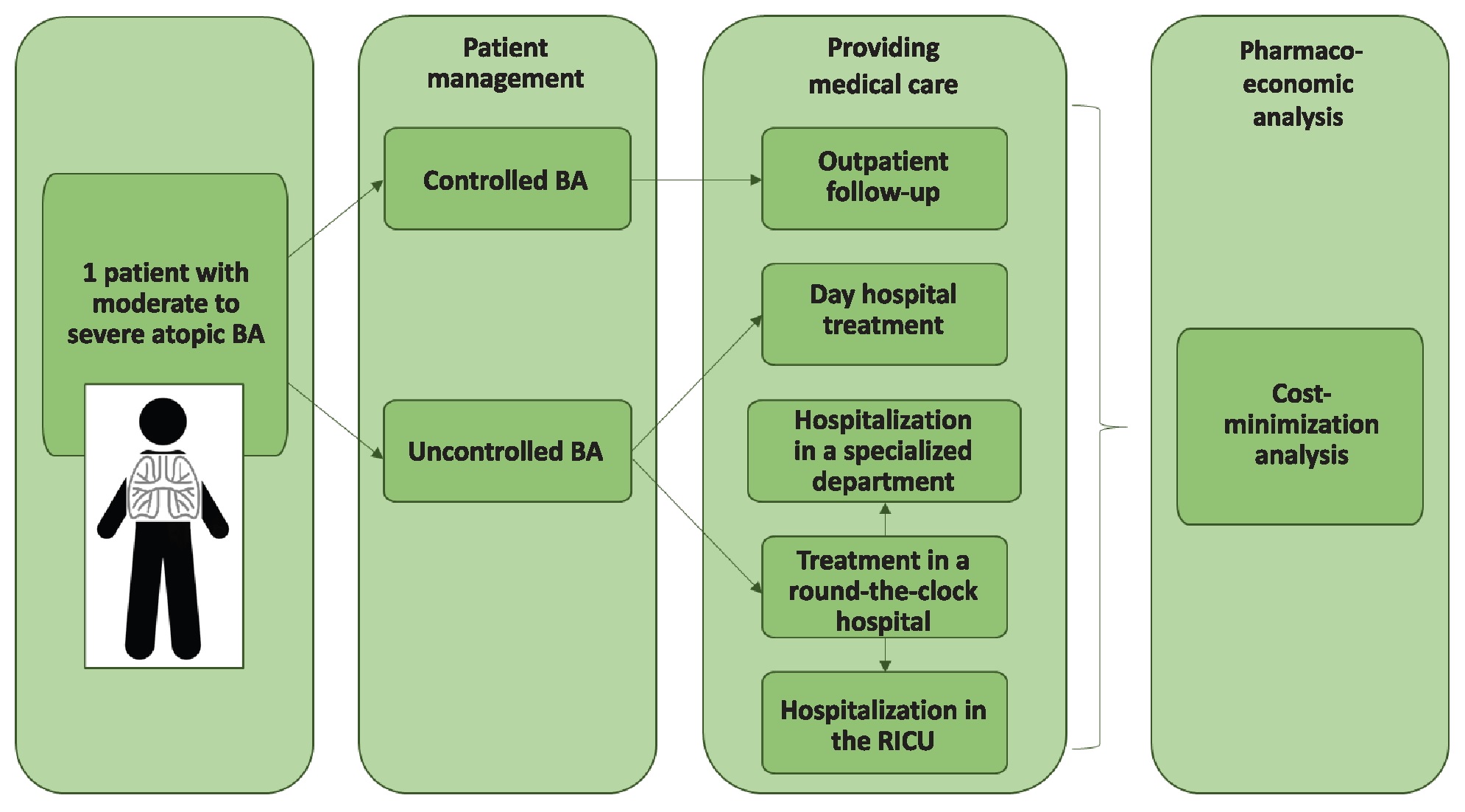 To assess the level of costs, in the course of the clinical and economic analysis, an algorithm for the provision of medical care to adult patients with atopic BA was developed. Since this form of asthma is characterized by frequent exacerbations, the resources of the health care system associated with their management, were assessed in the study. Their average annual frequency was calculated as the product of the frequency of exacerbations against the background of the absence of GEBDs therapy [32, 33] and the Incidence Rate Ratio (IRR), obtained on the basis of the meta-analysis by Agache I. et al., 2020 [29]. The tactics of management of exacerbations (the conditions for the provision of medical care) was determined on the basis of the previously published data [34, 35]. According to this algorithm, the provision of medical care to 1 adult patient with atopic BA was taken into account. The time horizon of the study was 1 year. The general research scheme is shown in Fig. 1.
