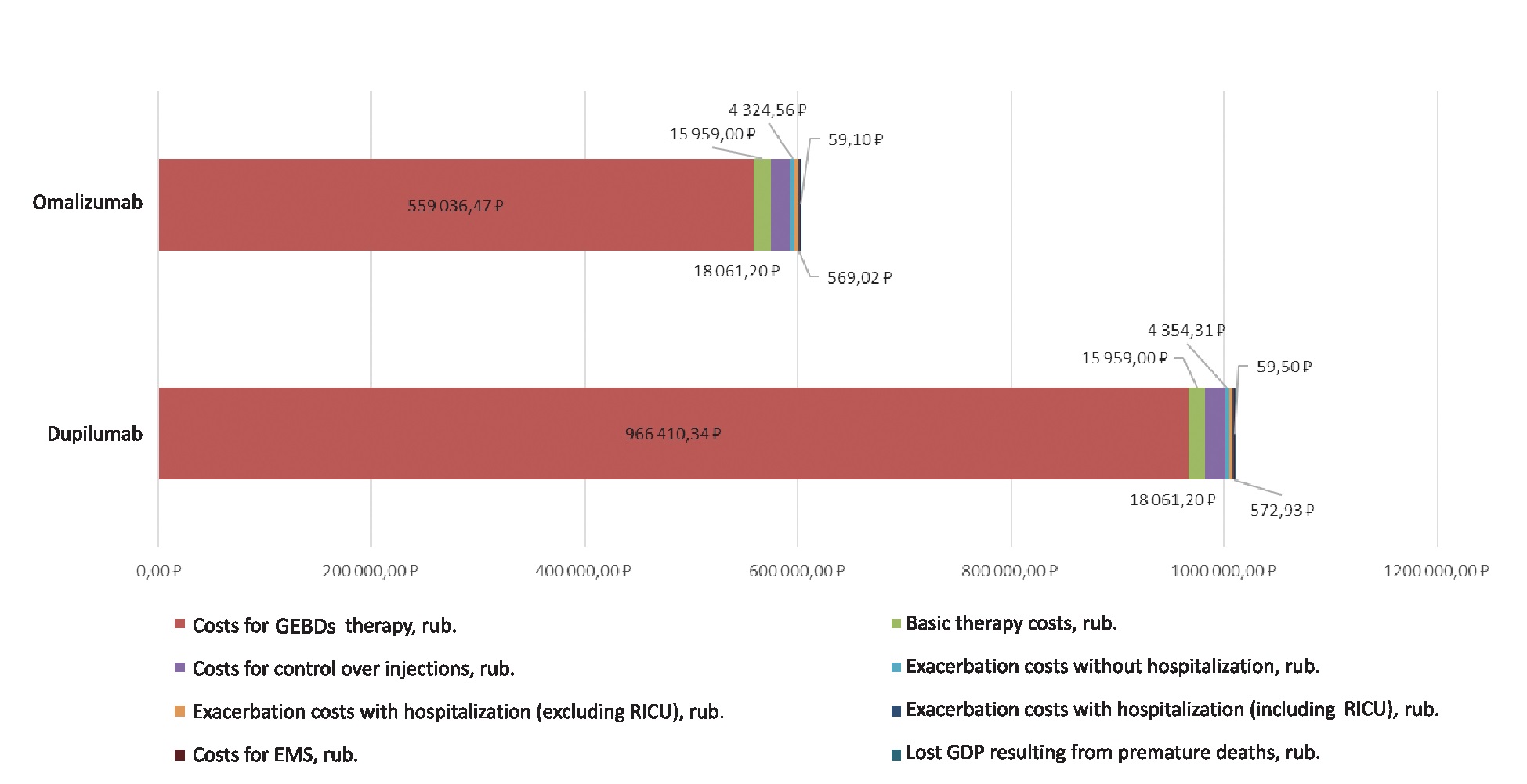 At the first stage, direct medical costs of GEBDs were determined, analyzed within the framework of this study. The dosage regimen of drugs was determined taking into account the official instructions for use8,9,10, the costs of drug therapy were determined per 1 patient for one year. Based on the data of the Register of Patients with Severe Bronchial Asthma (as at December 31, 2020)11, the average monthly doses of the analyzed drugs were determined: for omalizumab it was 383 mg, for dupilumab – 567 mg.