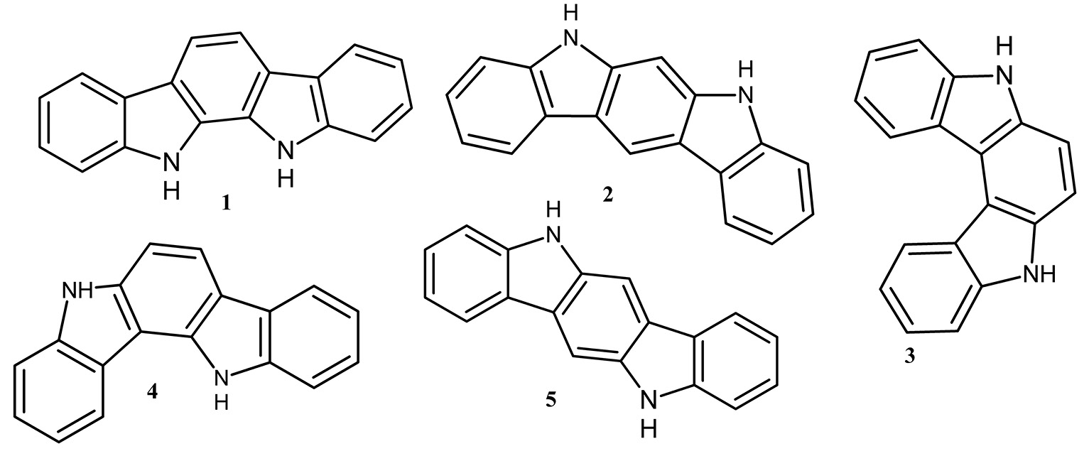 The class of indolocarbazoles includes 5 subclasses of compounds differing in the structure of a planar aromatic ring. In this case, 5 isomers of the polycyclic system – indolo[2, 3-a]carbazole (1), indolo[2, 3-b]carbazole (2), indolo[2,3-c]carbazole (3), indolo[3, 2-a]carbazole (4) and indolo[3, 2-b]carbazole (5) (Fig. 3) [18] – are meant.