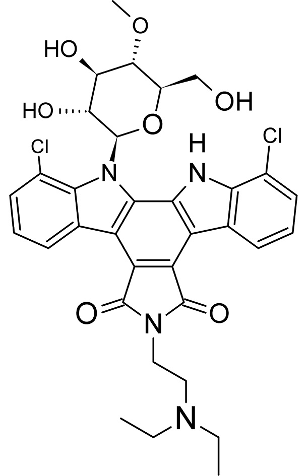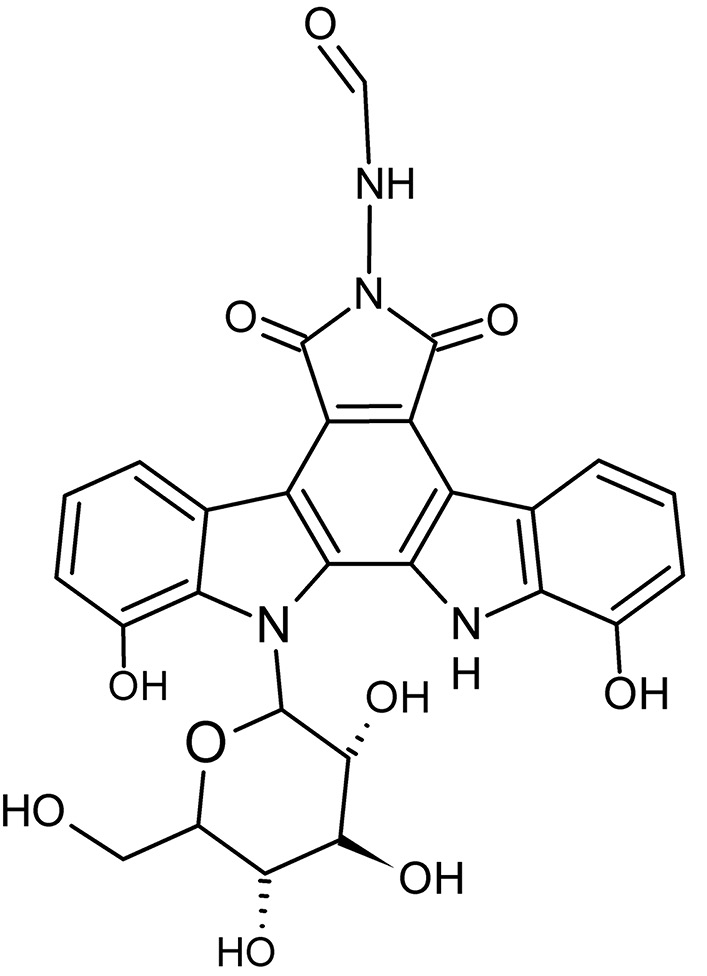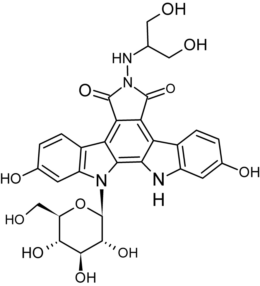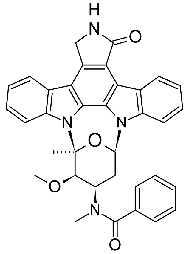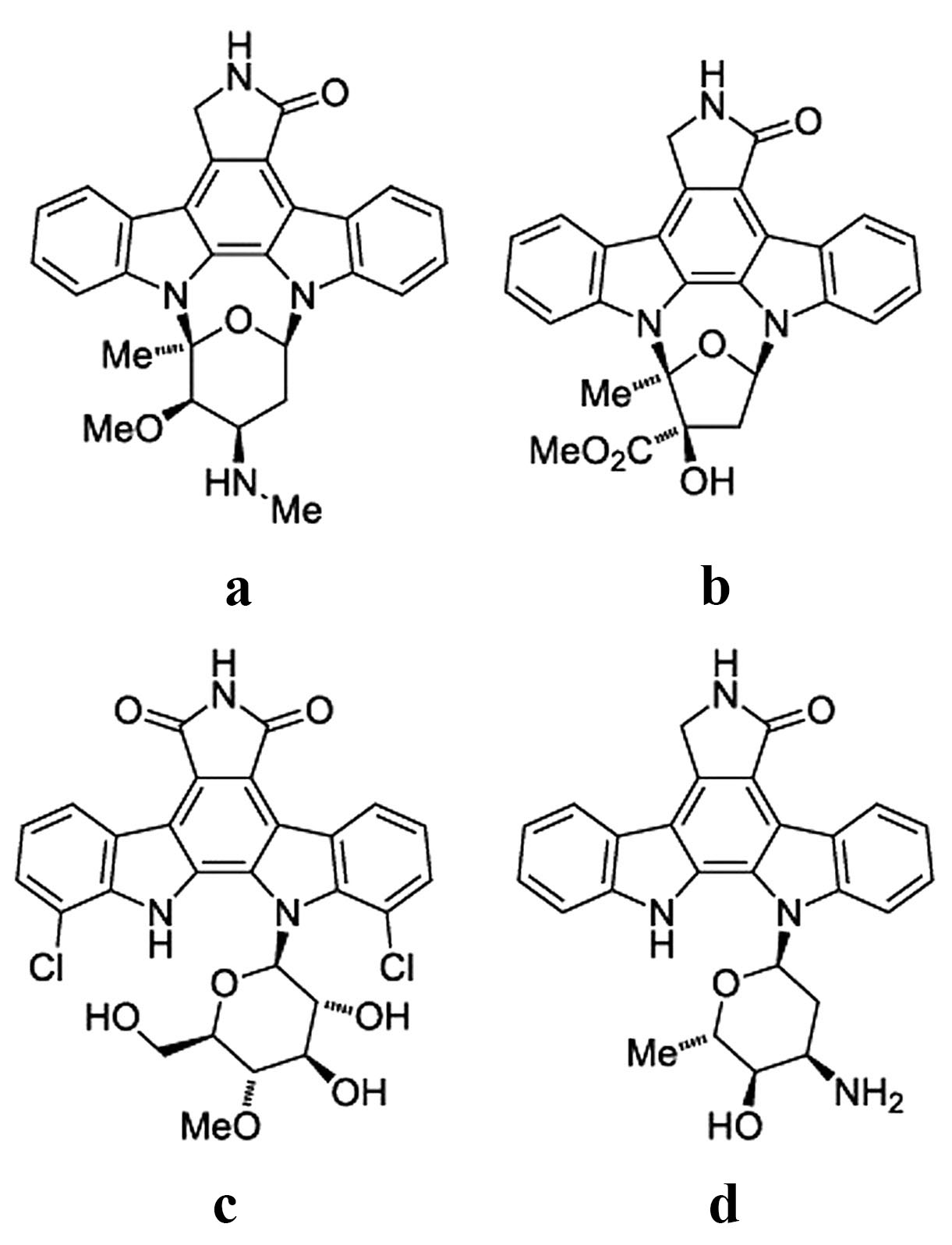 In order to increase the solubility and the biological activity, the hydrophobic indolocarbazoles staurosporin and rebeccamycin underwent various modifications: a) the addition of substituents to the upper heterocycle, replacement of atoms in the upper heterocycle or removal of a heterocycle, b) modification of flat chromophore, c) modification of replacement or removal of the carbohydrate moiety [37–39].