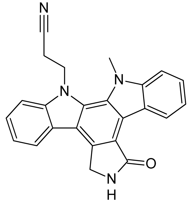 Go 6976 (Godecke AG, Germany) (Fig. 5) is an indolocarbazole derivative containing a propane nitrile radical instead of a glycosidic residue12. Go 6976 is a selective inhibitor of PKC α and β, it moderately inhibits the activation of protein kinase regulated by extracellular signals [79]. In addition, this indolocarbazole is a potential anticancer drug due to its ability to stimulate the formation of cellular compounds (the formation of an increased number of desmosomes and adhesions), to suppress migration and invasion of tumor cells [80].