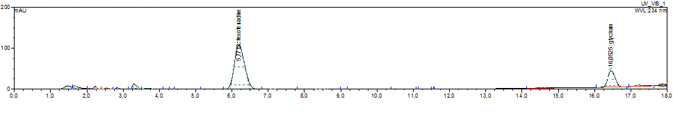 The presented results indicate that the retention times of the two main peaks on the chromatogram of the nasal spray solution match with the retention times of the peaks on the chromatograms of the standard samples solutions of fexofenadine hydrochloride and ammonium glycyrrhizinate.