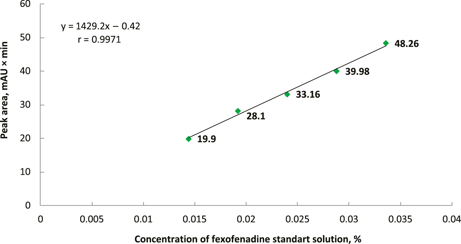 The linearity relative to fexofenadine hydrochloride and ammonium glycyrrhizinate, was established using standard solutions. The concentration range of solutions included the proposed analytical area of the methods – from 80 to 120% of each component5.