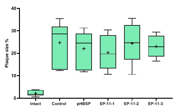 In accordance with the experiment design, a macroscopic assessment of the balloon injury-induced plaque in wildtype (intact group) and Polgmut/mut/Cdh5-CRE animals (the control group) was carried out. It was found out that in the control group of Polgmut/mut/Cdh5-CRE animals, lipid deposits serving a marker of atherosclerosis, were visualized in all preparations stained with Oil Red O. That resulted in an increase in the size of the plaque in the control group by more than 11 times. Against the background of the test peptides, when processing the data obtained in the assessment of the plaque size in the animals with the Polgmut/mut/Cdh5-CRE genotype, no statistically significant change in the plaque size was found out (Fig. 1).
