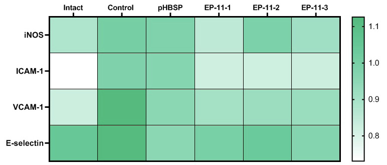 The study of the expression of the inflammatory markers group showed a significantly increased expression of iNOS, Icam-1, Vcam-1, and E-selektin in the control group of the animals with the Polgmut/mut/Cdh5-CRE genotype (Fig. 3). The test compounds with laboratory codes EP-11-1, EP-11-2, and EP-11-3, reduced the increased expression of the inflammatory genes iNos, Icam-1, Vcam-1 and E-selectin more effectively than the initial peptide pHBSP. The most pronounced effect was obtained in the group with the use of EP-11-1 (Fig. 3).