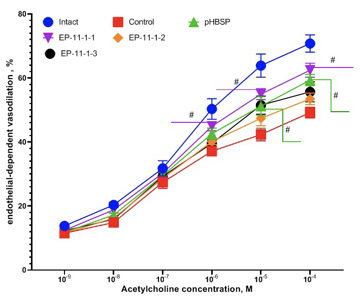 The compounds under study – innovative peptides with laboratory codes EP-11-1, EP-11-2, EP-11-3 – were administered intraperitoneally at the indicated doses for 7 days. On the 8th day from the beginning of the experiment, the experimental animals were anesthetized using the intraperitoneal injection of chloral hydrate at the dose of 300 mg/kg. Further on, in anesthetized mice, the thorax was opened to remove the thoracic aorta. The thoracic aorta was placed in a modified ice-cold Krebs Hanseleit solution (118 mM NaCl, 4.7 mM KCl, 1.2 mM Na2PO4, 0.5 mM MgCl2, 1.12 mM CaCl2, 25 mM NaHCO3 0.03 mM EDTA, 11 mM glucose) with pH 7.4. The aorta was carefully removed from the surrounding adipose and connective tissue and cut into short 2 mm transverse segments. The aortic rings were suspended in an organ bath (Biopac Bas System Station, Biopac systems, USA) containing 10 ml of a K-H solution maintained at 37° C, and 95% O2 and 5% CO2 were bubbled between two parallel stainless steel hooks. The isometric tension during the experiments was measured and recorded using the Biopac Systems USA software and hardware complex. The data acquisition and processing were performed using the Biopac Icq 4.2 software. Each aortic segment had been gradually stretched to an initial tension of 0.8 g and allowed to equilibrate in a standard 10 ml organ bath for 60 minutes prior to the experiment. After the scales equilibration, the segments were first contracted with 60 mM KCl to induce their contractile response and achieve a reproducible maximum contractile response, then they were washed with Krebs-Hanseleit solution three times to restore the tension to the basal level. The response of the aortic segments contraction to the submaximal concentration of phenylephrine (1 μmol/L) was induced 30 min after the restoration of the basal level. On the plateau of the epinephrine-induced contraction, the tests for endothelium-dependent and endothelium-independent vasodilation were performed. Acetylcholine (10-9-105 M) was cumulatively added to the aortic bath as an agent causing endothelium-dependent vasodilation, and sodium nitroprusside (10-9–10-5 M) was added as an agent causing endothelium-independent vasodilation. Sensitivity was defined as a relaxation percentage of the baseline value obtained at the epinephrine administration plateau.
