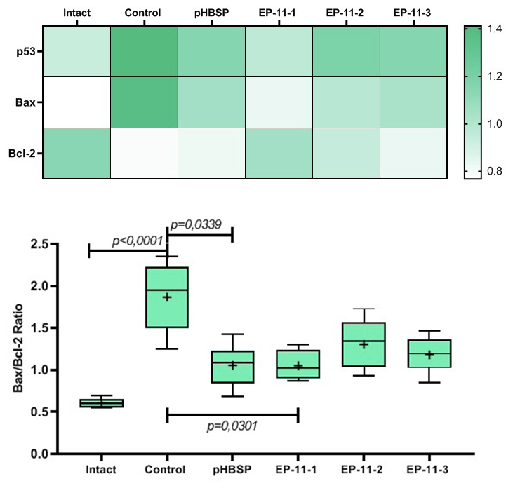 In addition to the macroscopic plaque assessment, a molecular biological analysis of atherosclerotic plaque tissue after the balloon-induced injury was performed in all experimental groups. Fig. 2 shows that against the background of balloon injury modeling, in the animals with the Polgmut/mut/Cdh5-CRE genotype, the expression of the markers of programmed cell death p53 and Bax is to a significant degree increased and the expression of the antiapoptic marker Bcl-2 is decreased. As the heat map presented in Figure 2A shows, peptides EP-11-1 and EP-11-2 statistically significantly compared with the control group of animals (p<0.05), reduce the expression of pro-apoptotic factors p-53 and Bax, as well as increase the expression of anti-apoptotic factor Bcl-2 (p <0.05). The most effective in terms of changing the expression of apoptosis factors was EP-11-1 – the expression values of the p53, Bax and Bcl-2 genes did not differ from those in the control group (Fig. 2A).