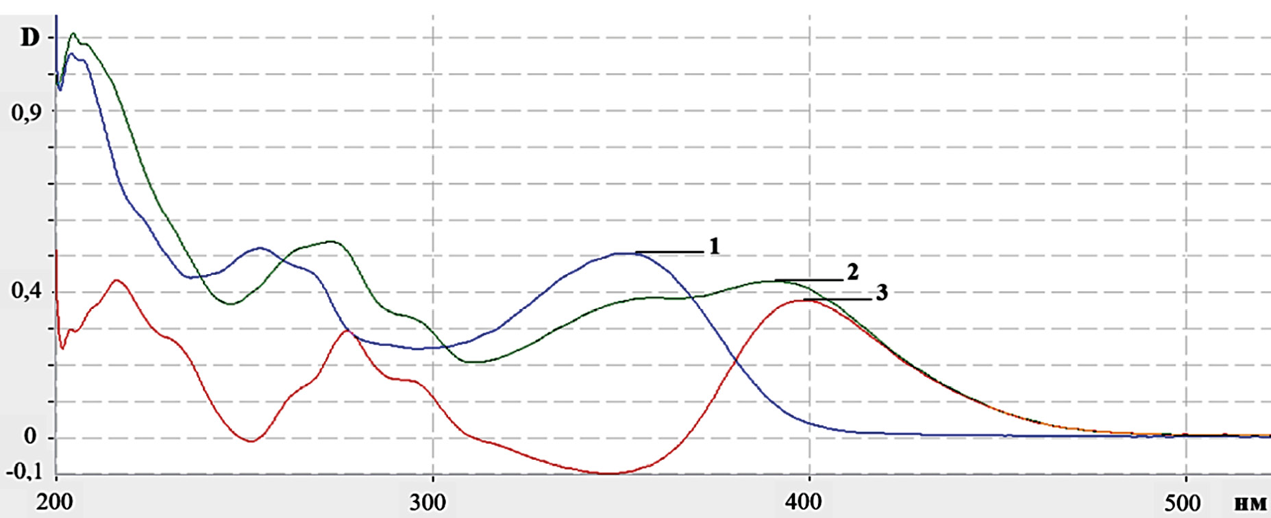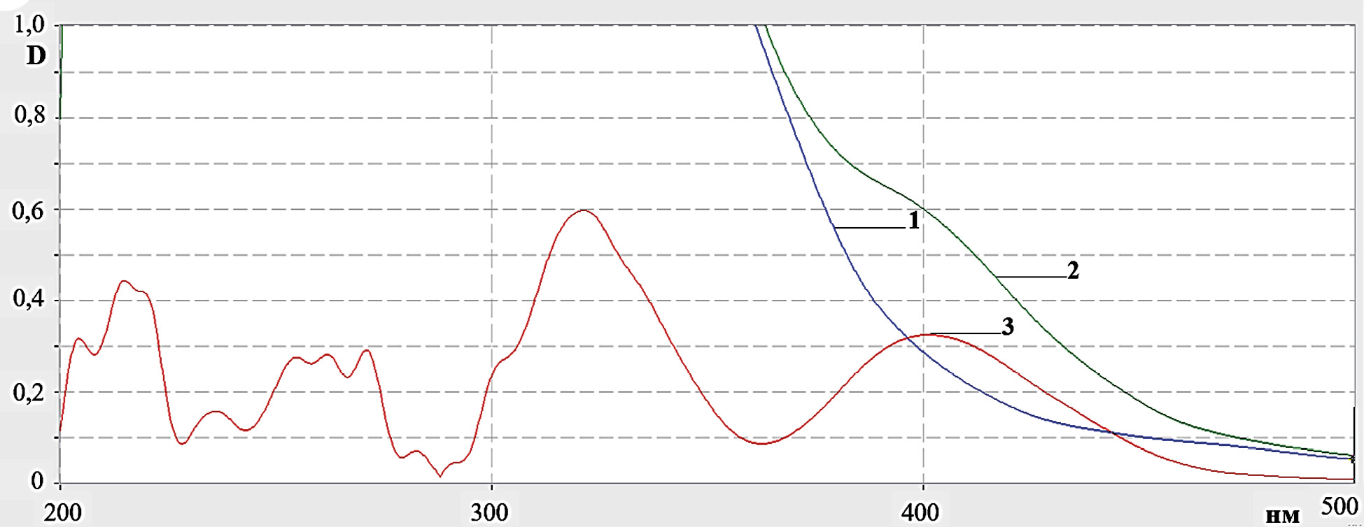 Figure 2 – Electronic spectra of solutions of aqueous-alcoholic extraction from Quercus robur L. buds. Note: 1 – extraction solution (direct spectrophotometry); 2 – extraction solution with addition of aluminum chloride; 3 – differential curve