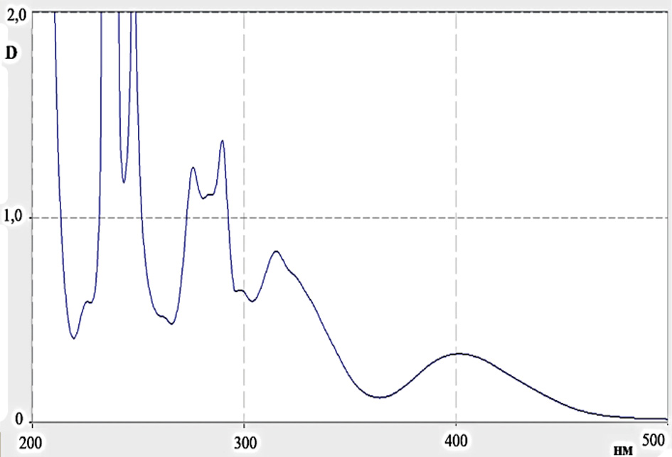 The method of differential UV spectroscopy is widely used for the qualitative and quantitative assessment of BASs in plant raw materials [1, 15, 17–21]. The essence of differential spectrophotometry is the complex formation of aluminum cation, carbonyl and hydroxyl groups of flavonoid resulting in the stable complex formation, due to which the so-called bathochromic shift occurs [1, 19]. The differential spectrophotometry method was used in the development of methods for the quantitative determination of flavonoids in Leontodon autumnalis L. raw materials after the formation of a stained complex with an aluminum chloride solution [20]. This method was also used in the process of the development of the quantitative determination method of total flavonoids in Juglans regia L. leaves using the rutin standard sample at the analytical wavelength of 416 nm in order to solve the issues of the new type standardization of medicinal plant raw materials [22]. Differential spectrophotometry was used in the development of methods for the quantitative determination of total flavonoids in Tagetes patula flowers using a patulitrin standard sample (7-O-β-D-glucopyranoside 3,5,7,3’,4’-pentahydroxy-6-methoxyflavone) at the analytical wavelength of 428 nm [22]. As a result of the analysis of the above mentioned studies, it can be concluded that the method of differential spectrophotometry is in demand in modern pharmaceutical practice in the standardization of medicinal plant raw materials [22].