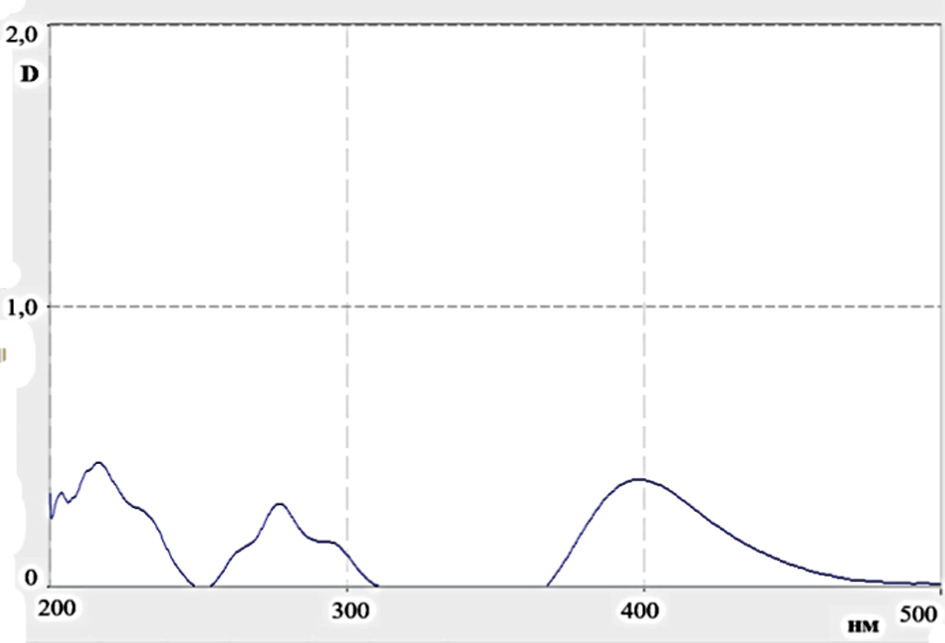The development of the methods was carried out stage by stage. At the first stage, the absorption spectra of aqueous-alcoholic extractions on the basis of Quercus robur L. buds were studied. During the analysis of the obtained extracts by differential spectrophotometry, the absorption maxima of spectral curves characteristic for the substances of the flavonoid nature, were determined (Fig. 2). A bathochromic shift of the electronic absorption spectrum of the aqueous-alcoholic extractions of Quercus robur L. buds with an absorption maximum similar to that of the standard sample of a cynaroside solution (400 nm) was recorded (Fig. 3). Therefore, when carrying out the quantitative determination of total flavonoids in the aqueous-alcoholic extractions based on Quercus robur L. buds, cynaroside was chosen a standard sample (Fig. 4 and 5). The observed similar picture of spectral absorption curves in the analysis of the studied samples of raw materials and the cynaroside standard sample solution, makes it possible to assert that in aqueous-alcoholic extractions of Quercus robur L. buds flavonoids are present, and the method of differential spectrophotometry makes it possible to carry out their quantitative definition.