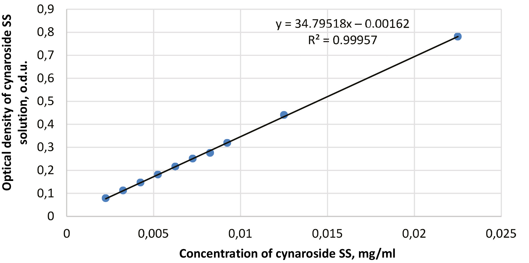 The methods linearity was determined for a series of 10 cynaroside solutions (with the concentrations ranging from 0.00225 to 0.0225 mg/ml: 0.00225; 0.00325; 0.00425; 0.00525; 0.00625; 0.00725; 0.00825; 0.00925; 0.0125; 0.0225) with aluminum chloride at the wavelength of 400 nm. Based on the data obtained, a dependence graph of the optical density values of cynaroside solutions with aluminum chloride on the concentration of cynaroside was constructed, and then a linear regression equation was calculated (Fig. 6; Table 2).