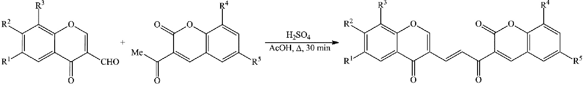 (E)-3-(3-(4-oxo-4H-chromene-3-yl)acryloyl)-2H-chromene-2-one derivatives 1-15 were synthesized by refluxing of equimolar amounts of the corresponding substituted 3-formylchromones and 3-acetylcoumarins in glacial acetic acid in the presence of catalytic amounts of concentrated sulfuric acid (Scheme 1).