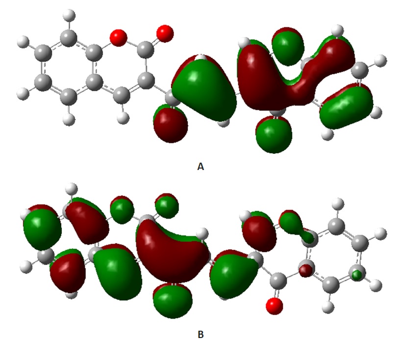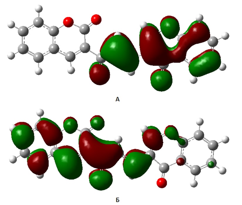 Figure 1 – Distribution of frontier orbitals in compound 1. Note: A – HOMO; B – LUMO