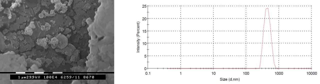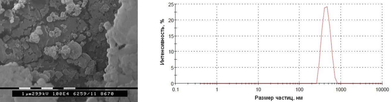Note: A – scanning electron microscopy (200–600 nm); B – dynamic light scattering method (585.9 nm)