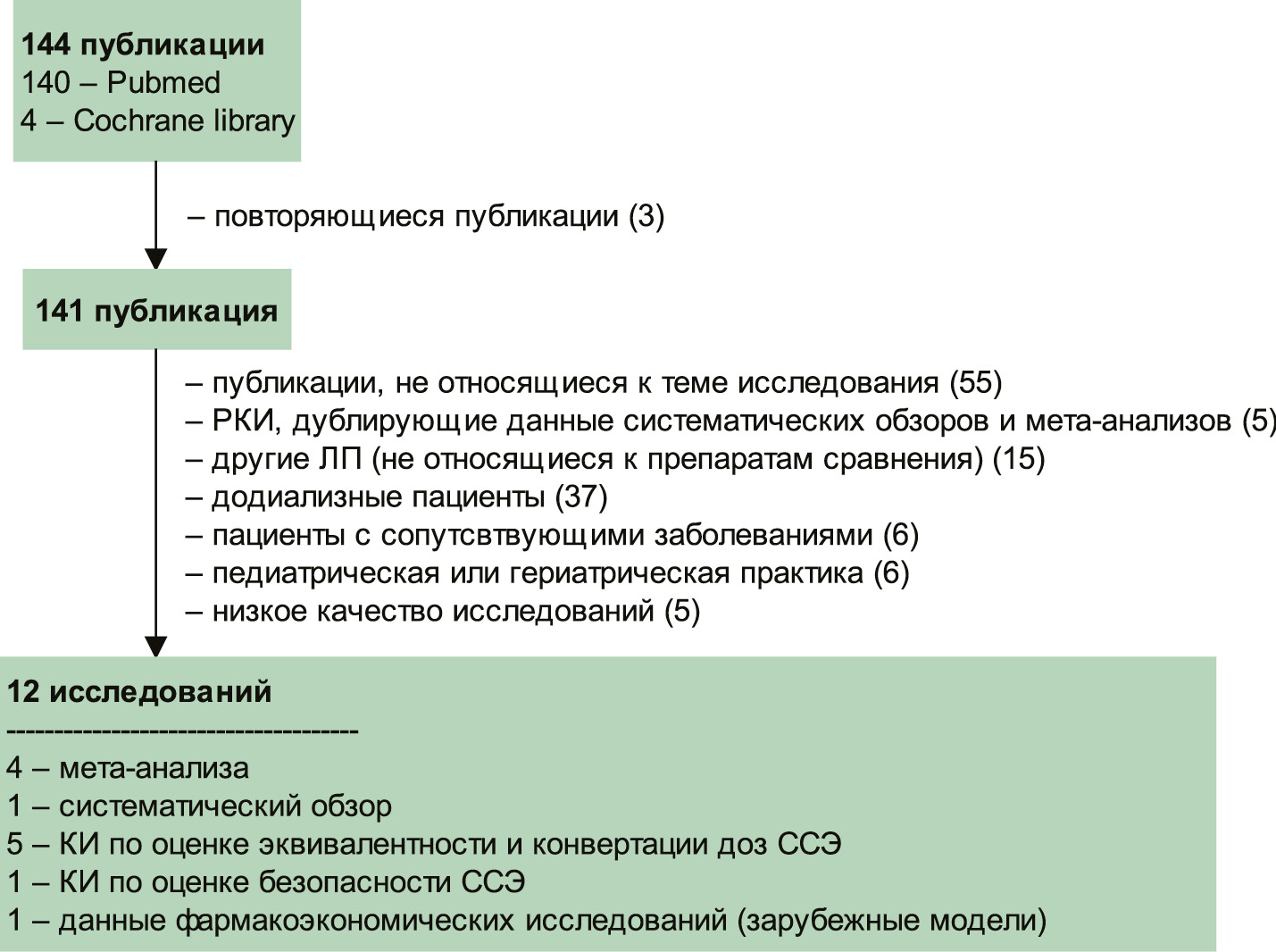 In the selection of works, the preference was given to meta-analyzes, randomized controlled trials (RCTs), systematic reviews, then to clinical trials (CTs) without randomization. The following studies were excluded from the analysis: animal studies; the studies devoted to the research of the dosage form of the drug; CI 1–2 phases; research conducted in pediatric and/or geriatric practice; CTs in the cohort of pre-dialysis patients, CTs in the cohort of patients with concomitant diseases: cancer, diabetes, HIV infection, etc.