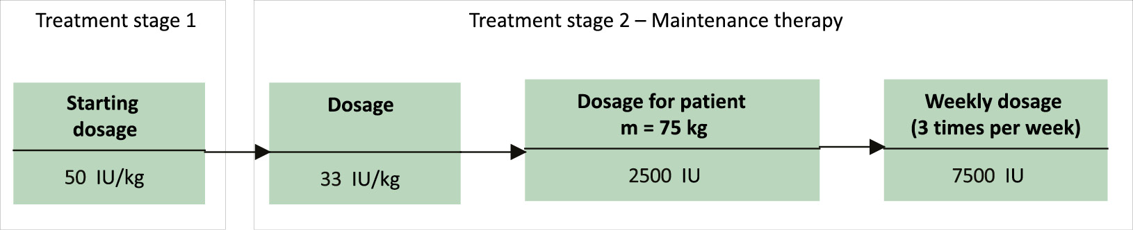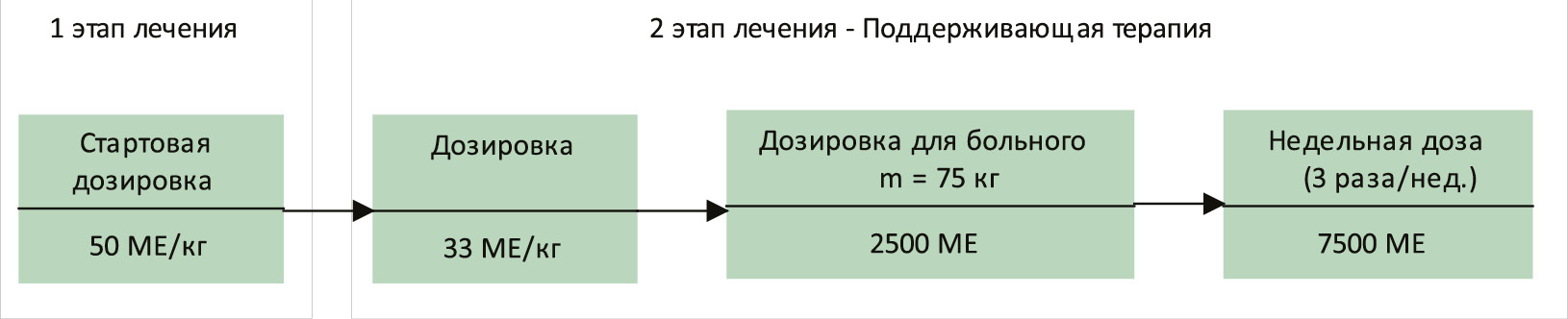 At the next stage of the study, the dosage of EPO alfa for the maintenance therapy stage according to the instructions on the drug was calculated. Thus, for maintenance therapy, it is recommended to reduce the starting dose of 50 IU / kg by 1.5 times (Fig. 2).