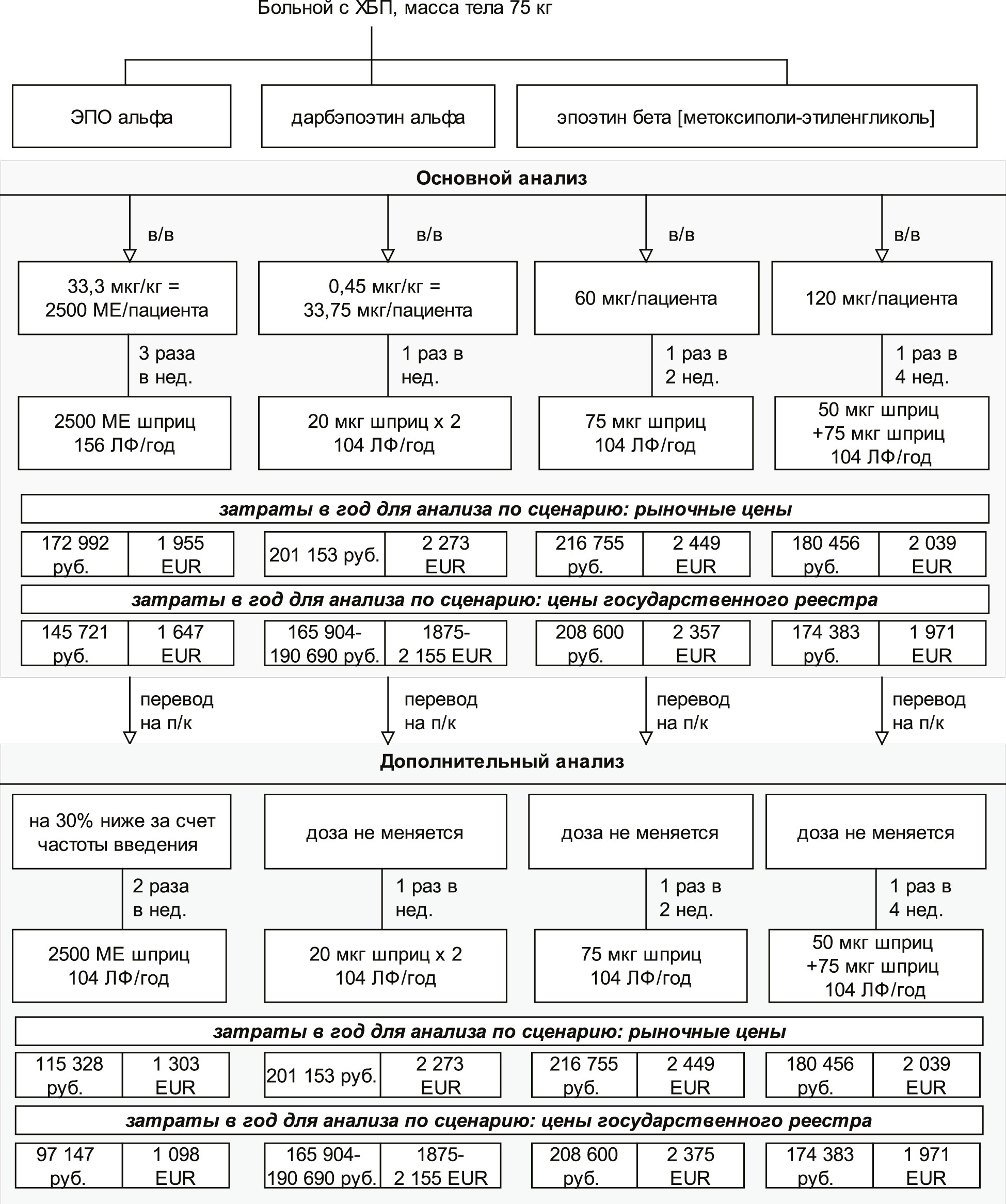 Materials and methods. The study took into account direct medical costs of nephrogenic anemia pharmacotherapy on the basis of 1 year maintenance therapy according to the following scheme: epoetin alfa – 3 times per week, darbepoetin alfa – once per week, methoxy polyethylene glycol – epoetin beta – once per 2 or 4 weeks. A “costs minimization” analysis was performed for equivalent maintenance epoetins doses for intravenous and subcutaneous administrations. Epoetin alpha equivalents were calculated for an average patient weighing 75 kg by converting a weekly dose of short-acting epoetin (7500 IU) into equivalent doses using dose conversion factors.