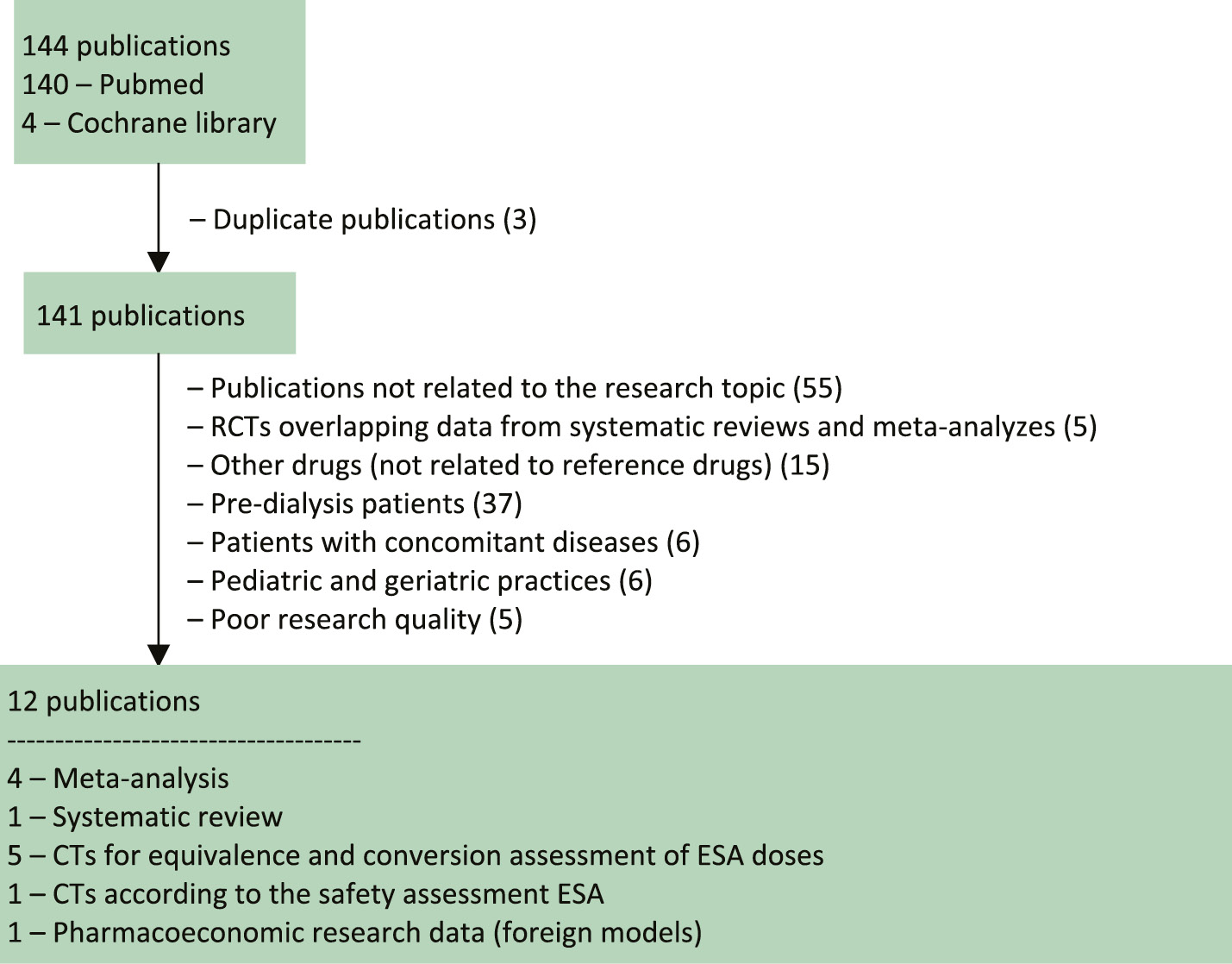 The search and selection of literature data on the effectiveness and safety of r-HuEPO for the nephrogenic anemia treatment in adult dialysis patients was carried out in the available medical databases: PubMed database, Cochrane Library. The keywords were: epoetin [All Fields] AND CKD [All Fields] AND (“renal dialysis” [MeSH Terms] OR (“renal” [All Fields] AND “dialysis” [All Fields]) OR “renal dialysis” [All Fields ] OR “dialysis” [All Fields] OR “dialysis” [MeSH Terms]). The search depth was 15 years – January 2006 – July 2020, the studies carried out in 2005 and earlier, were excluded from the further analysis.