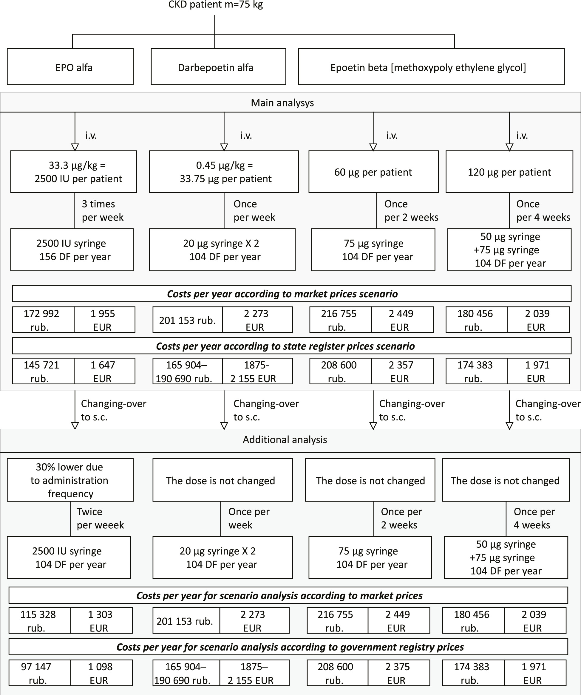The study time horizon was 1 year of continuous erythropoietins therapy. Since modern approaches to the anemia treatment often involve the beginning of anemia correction at the pre-dialysis stage of CKD treatment, when calculating the costs for long-acting epoetin beta, the study included dialysis patients and the ones who had been treated with EPO preparations in the volume equivalent to the average maintenance dose of EPO alfa or DA (<8000 IU per week and <40 μg per week, respectively) 1, 3.