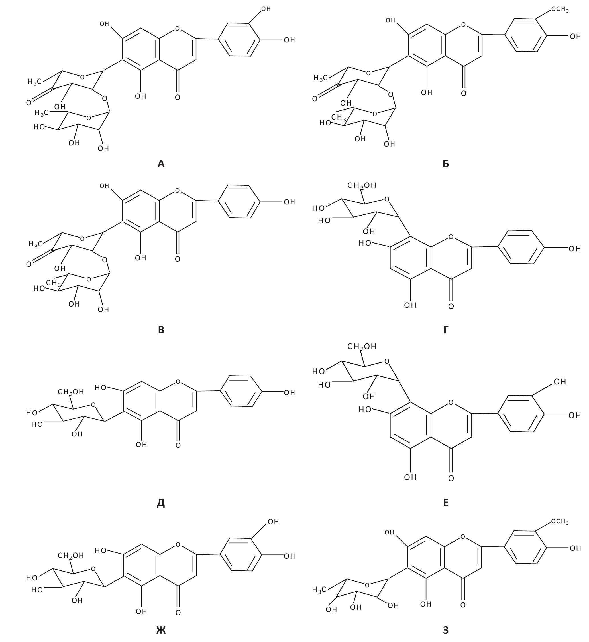 Zea maydis styli cum stigmatis phenolic compounds have a fairly representative composition, in which flavonoids are rightfully the most significant. Their role as the most likely carriers of the Zea maydis styli cum stigmatis pharmacotherapeutic activity was previously emphasized. Currently, it is confirmed by the requirements of regulatory documentation regarding the quantitative content of compounds of a flavonoid character [4]. According to the literature data, luteolin and apigenin derivatives are considered the predominant Zea maydis styli cum stigmatis flavonoids: maisin, methoxymaisin, apimaisin, vitexin, isovitexin, orientin, isoorientin, and a number of others [6–9]. The structural formulas of the main Zea maydis styli cum stigmatis flavonoids are shown in Fig. 1.
