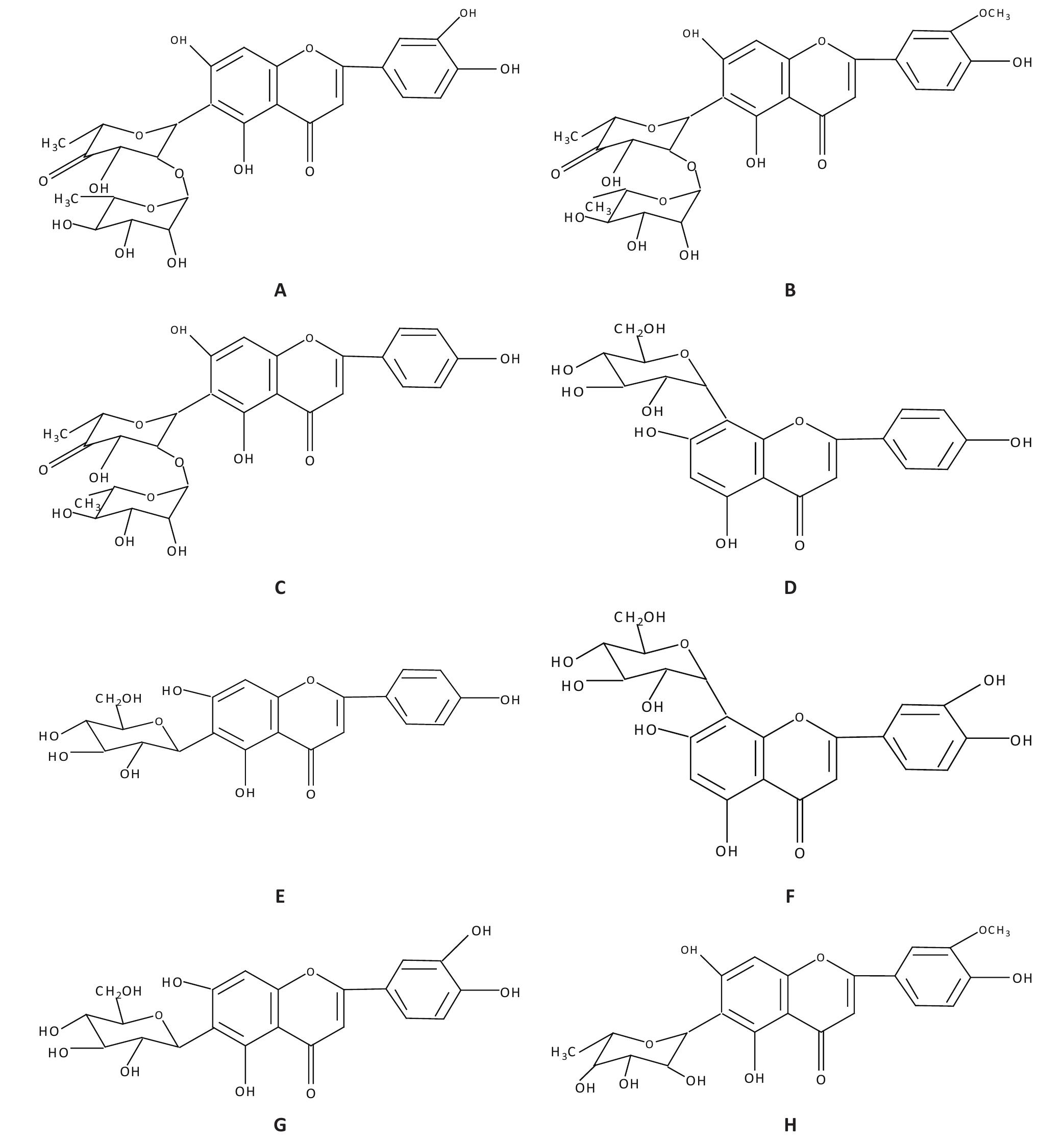 Note: A – maisin; B – methoxymaisine; C – apimaisin; D – vitexin; E – isovitexin; F – landmark; G – isoorientin; H – chrysoeriol 6-C-β-fucopyranoside.