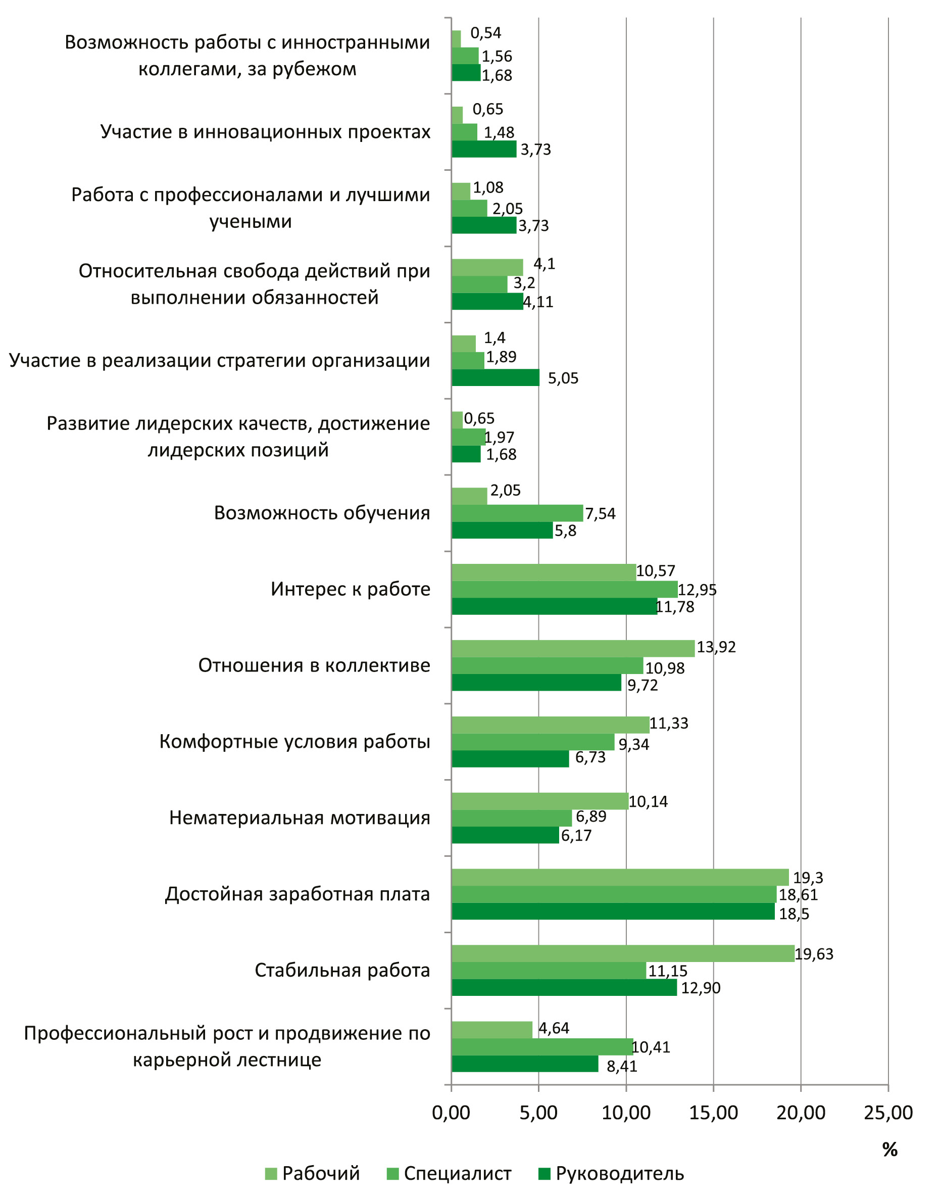 Примечание: X – среднее арифметическое оценки респондентов; pt – t-критерий Стьюдента; pu – u-критерий Манна-Уитни; σ – среднее квадратическое отклонение; α – коэффициент альфа Кронбаха; n – количество наблюдений; * – <0,05 в сравнении с рабочим; ** – <0,05 в сравнении со специалистом; *** – <в сравнении с руководителем.