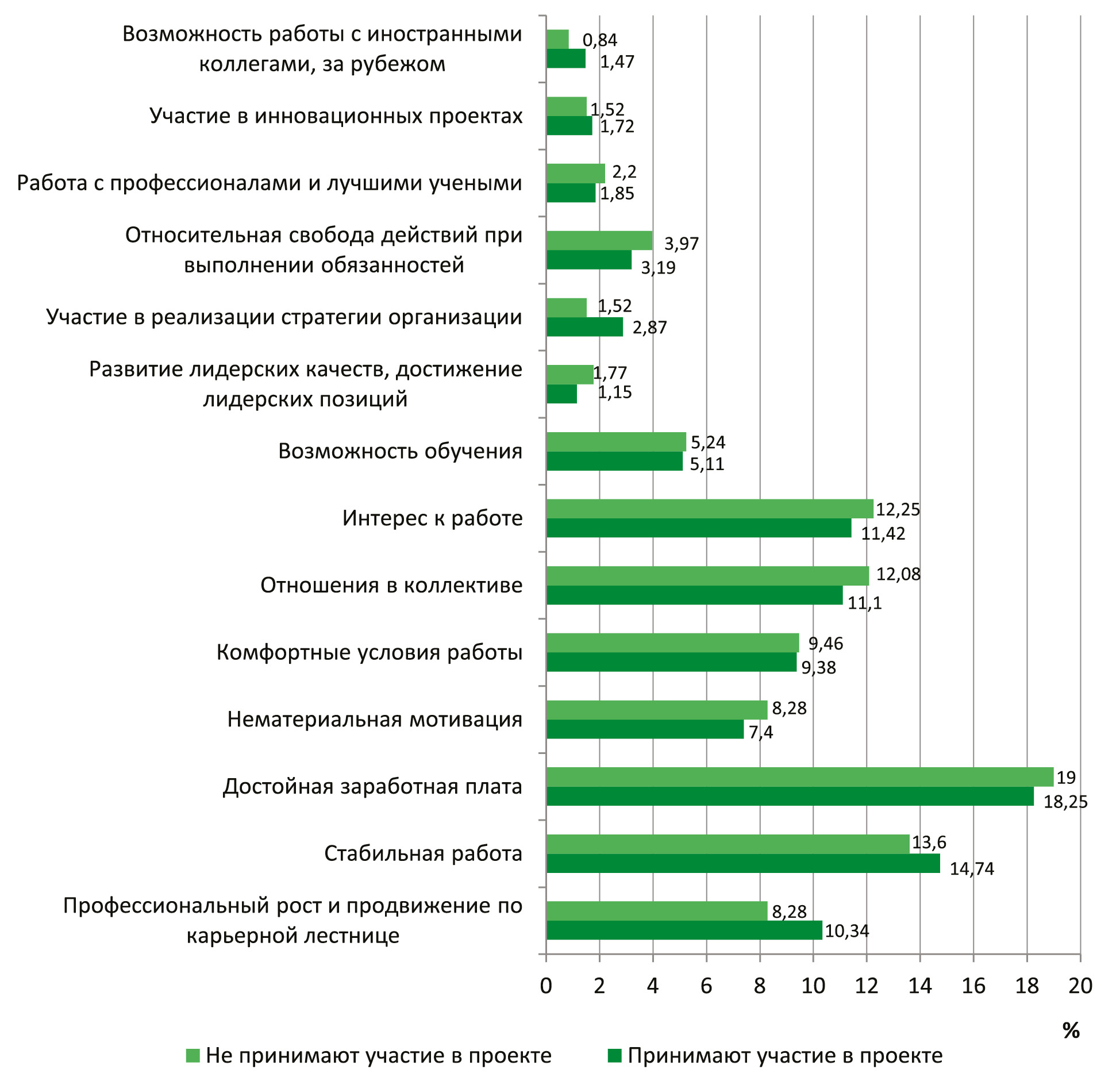Анализ данных показал (рис. 1), что лидирующие позиции заняли такие мотивационные факторы, как достойная заработная плата, стабильная работа, интерес к работе, отношения в коллективе, комфортные условия и возможности профессионального роста. В меньшей степени представлена нематериальная мотивация (деятельность профсоюза, эффективность программ в рамках ДМС, корпоративная культура, атмосфера в коллективе, взаимоотношение с коллегами), возможность обучения (совершенствование и расширение спектра профессиональных навыков, изучение иностранных языков). Остальные факторы (возможность работы с иностранными коллегами, за рубежом, работа с профессионалами и лучшими учеными, относительная свобода действий при выполнении обязанностей, участие в реализации стратегии организации, развитие лидерских качеств, достижение лидерских позиций) не преодолели 5% барьер. При этом следует обратить внимание на низкие показатели такого фактора, как участие в инновационных проектах, что указывает на недостаточную осведомленность персонала в разрезе выгоды для каждого участника инновационного процесса. Результаты распределения ключевых мотивирующих факторов для персонала в зависимости от их участия в проекте указывают на преобладание тех же критериев, которые были выявлены при анализе по категориям персонала (рис. 2).