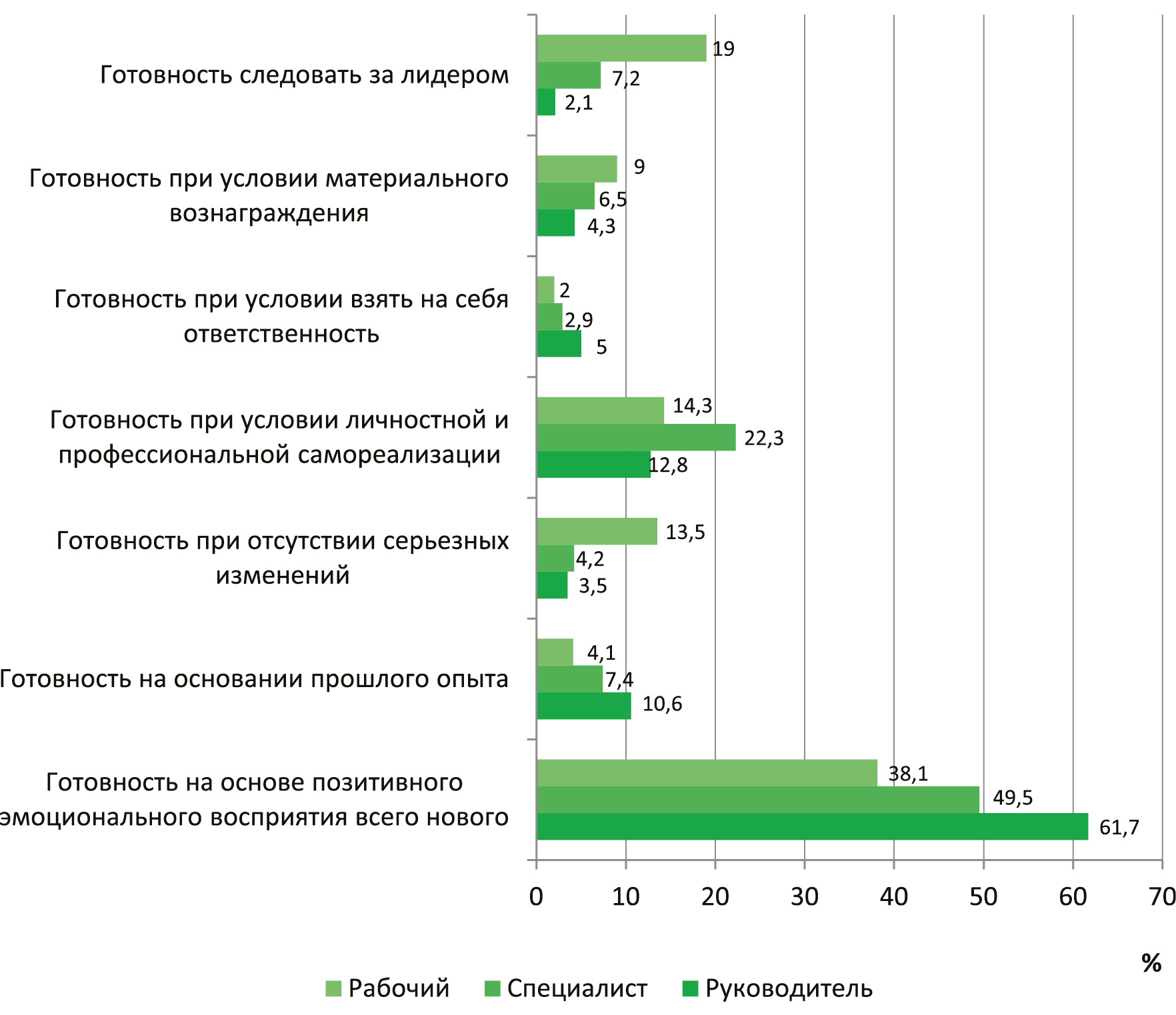 Фактор готовности последовать за лидером в большей степени был выражен среди сотрудников рабочего звена: работник поддерживает организационное новшество при условии, что есть лидер, который будет объяснять, брать на себя ответственность, контролировать.